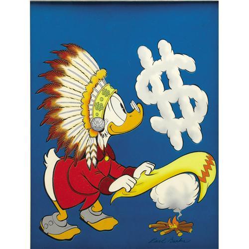 <B>Carl Barks - Uncle Scrooge #39 Cover Original Art (Dell, 1962).</B></I> This imaginative image of Uncle Scrooge in an Indian headdress was created by Carl Barks in 1962. This is the earliest <B>Uncle Scrooge</B></I> original cover art known to exist, and arguably, the best. The art is enhanced with a three-color overlay of yellow, red and blue film which adds color to Barks' original black line art. The image area measures 11" x 14". Custom matted and framed and in Excellent condition. <I>From the Estate of Bruce Hamilton</B></I>. <BR><BR><B>Important notice:</B> Heritage usually auctions material at the rate of 200-250 lots per hour. On some occasions eBay Live bid software or the Internet may not be able to keep up with the pace of the auction. We recommend placing a realistic absentee bid now as insurance to avoid disappointment. Occasionally the auctioneer may eliminate or reject an eBay Live bid, and the auctioneer may also reopen a lot after the close of the eBay live bidding (usually because we missed an audience bid), and may reject your bid even if it shows you as the winning bidder. By bidding via eBay Live, you agree that Heritage may award the lot to another bidder at its sole discretion under the circumstances described above or any other reasonable circumstances. Since eBay bids are not shown to us until we open the lot on the floor, we treat those bids just like floor bids. In most cases the floor responds before the eBay bid is presented to us, due to Internet lag time, so for consistency we have made it a policy that floor bids are always considered first over tie eBay live bids. Also please note that all Heritage lots purchased through eBay Live carry a 22.5% Buyer's Premium. Please make sure you read the Terms and Conditions before you bid. This lot is being auctioned in conjunction with a live floor auction by Heritage Auction Galleries. All final auction and invoice information will be supplied by Heritage Auction Galleries, and all other information should be considered preliminary. Lot:41001 <BR><BR><B>Winning Notification and Billing:</B> After the FINAL session in this auction is complete, Heritage will send e-mail and snail mail invoices. This process normally takes several days. All final auction and invoice information will be supplied by Heritage Auction Galleries, and all other information should be considered preliminary. <BR><BR>This auction will be conducted on a live auction floor and over the Internet through eBay Live. If you choose to place an absentee bid, please take a moment to <font color='#0000ff'><u><a href='http://pages.ebay.com/liveauctions/help/before/laabsentee.html'>learn how eBay Live absentee bidding works</a></u></font><font color='#000000'>