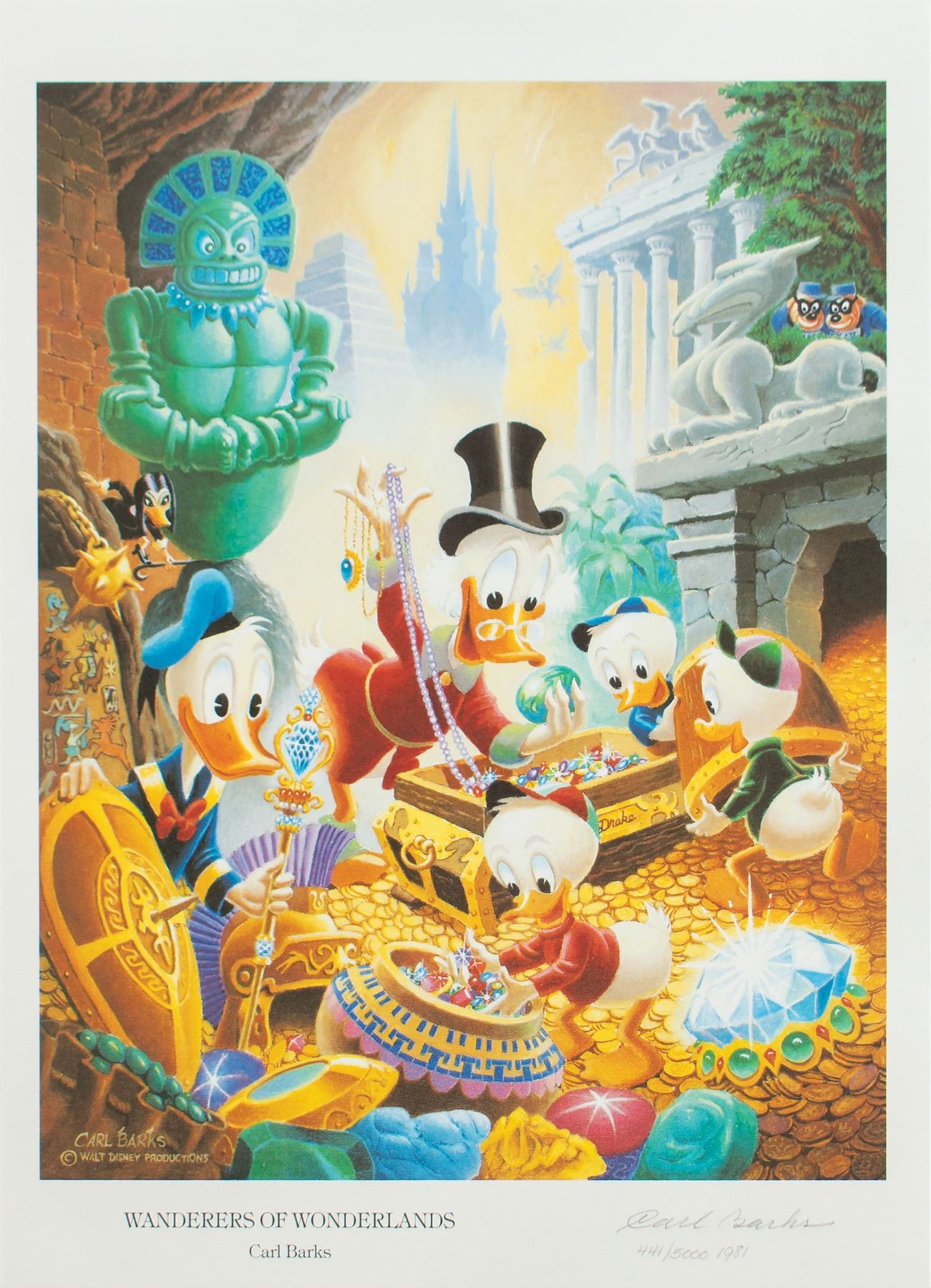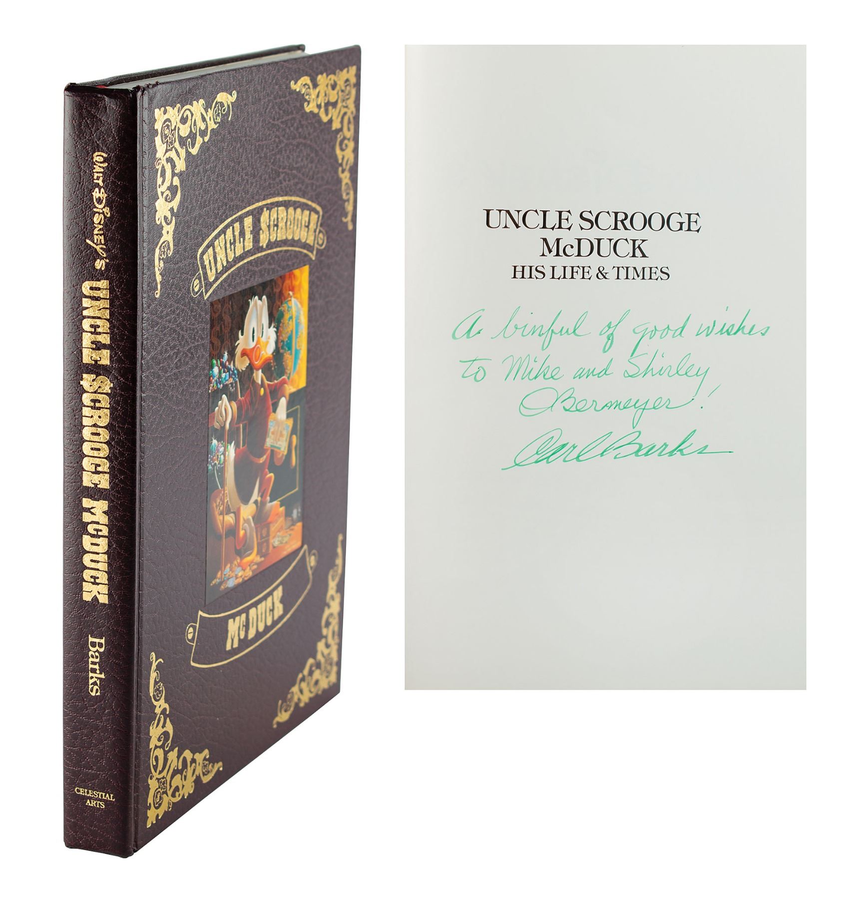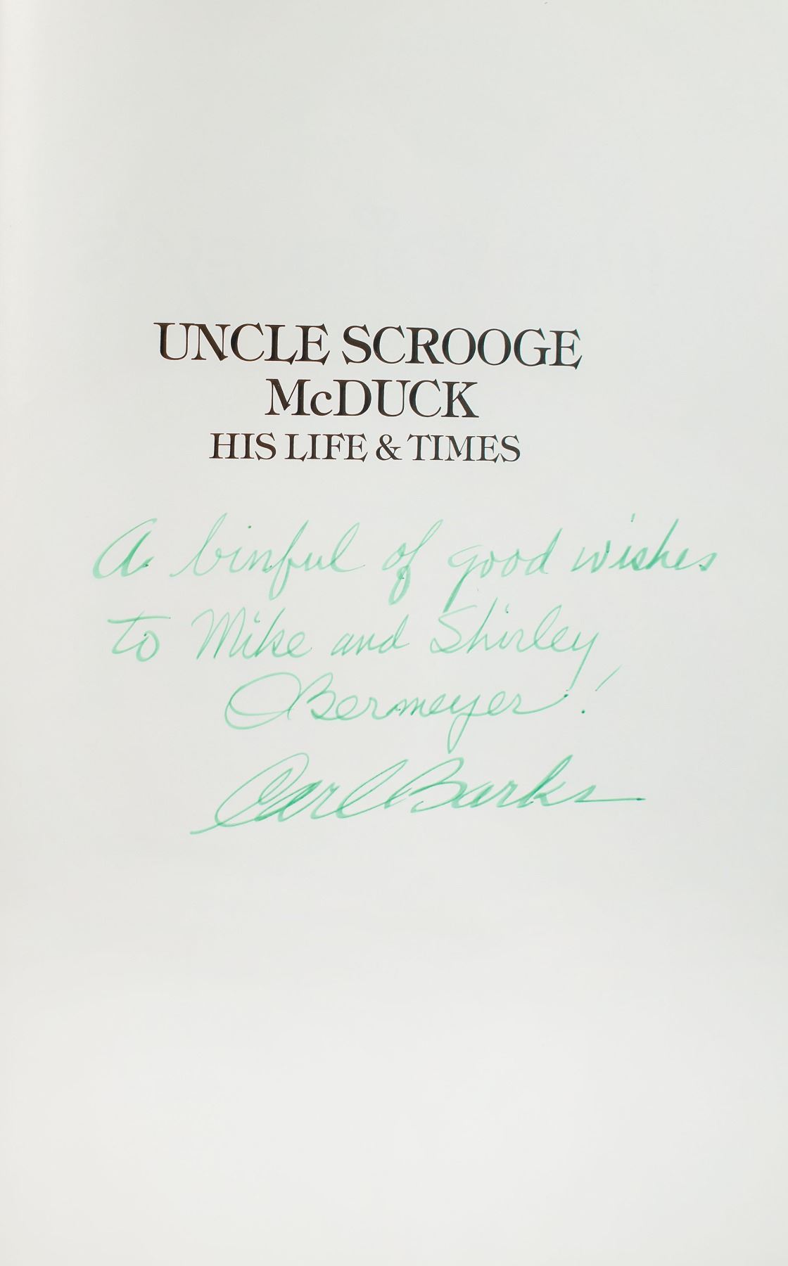Signed book: Uncle Scrooge McDuck: His Life & Times. First edition, limited issue, numbered 441/500. Millbrae, CA: Celestial Arts, 1981. Hardcover, 9.75 x 13.25, 373 pages. Signed and inscribed on the half-title page in green ink, "A binful of good wishes to Mike and Shirley Obermeyer, Carl Barks." Includes the color limited edition 8.75 x 11.75 print originally included, entitled 'Wanderers of Wonderland, also numbered 441/5000, signed in the lower right corner in pencil by Carl Barks. In fine condition.