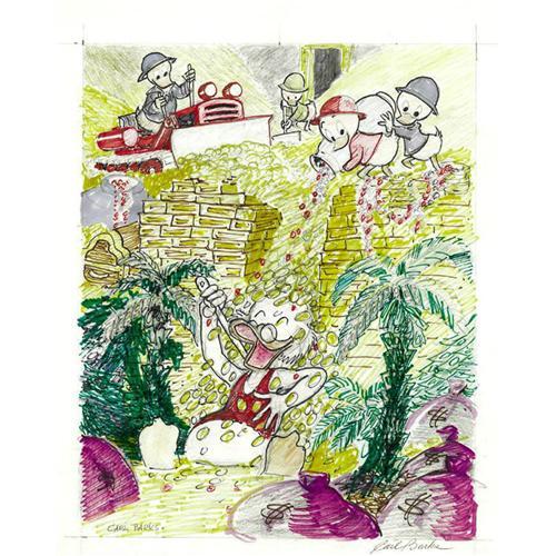 <B>Carl Barks - Uncle Scrooge "Money Bin Shower" Sketch Original Art (undated).</B></I> This amazing scene reveals more of the top-secret and private goings-on in Uncle Scrooge's fabled money bin. "Money Bin Shower" was a full-color preliminary study for a painting that was never executed. Carl Barks told a collector that he couldn't resist coloring this design to establish a color-key for the proposed painting. The cascade of greenback paper money and waterfall of coins and jewels atop Uncle Scrooge's head has him in a giddy state of ecstasy as Donald Duck and Huey, Dewey, and Louie look on. The drawing was rendered in mixed-media -- in pencil, ink, and Pentel pens. This is an event that the larcenous Beagle Boys often dream of interrupting, by pulling the plug on the money bin! The image area is 16" x 20". The piece is in Excellent condition, and Carl Barks has signed the drawing twice, once in his traditional block printing, and also in cursive. Jump in and bid, the "water's fine!"