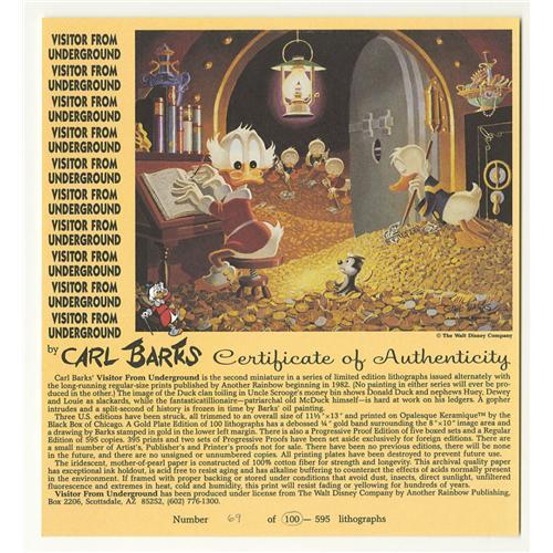 <B>Carl Barks - "Visitor From Underground," Gold Plate Edition Miniature Lithograph, numbered 69/100 (Another Rainbow, 1991).</B></I> The Duck clan toils away in Uncle Scrooge's money bin. Donald Duck, Huey, Dewey, and Louie are exhausted, but Uncle Scrooge is still going strong, working at his ledger. Meanwhile, a frisky gopher digs his way to the surface of the lucre pile! This was the second miniature lithograph issued by Another Rainbow. The lithograph is numbered 69/100. The print has an overall size of 13.5" x 11". This Gold Plate Edition features a gold trim border and a drawing by Barks stamped in gold in the lower left margin. Carl Barks signed and numbered the lithograph at the lower right, and the print is in Excellent condition. A numbered Certificate of Authenticity is included in the lot.