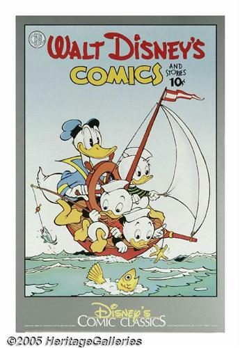 <B>Carl Barks - Walt Disney's Uncle Scrooge Print (Another Rainbow, 1987).</B></I> Donald Duck and his nephews take to the high seas in this splendid reproduction of the cover from Carl Barks' <B>Walt Disney's Comics and Stories</B></I> #108 (Sept. 1949). This first-class print was published by Another Rainbow Publishing Company, as number 1 in the Comic Book Library series. This print measures 24" x 36" and is in Excellent condition.