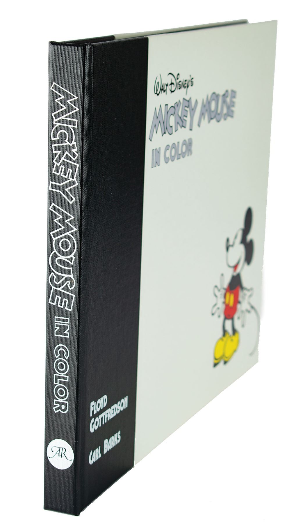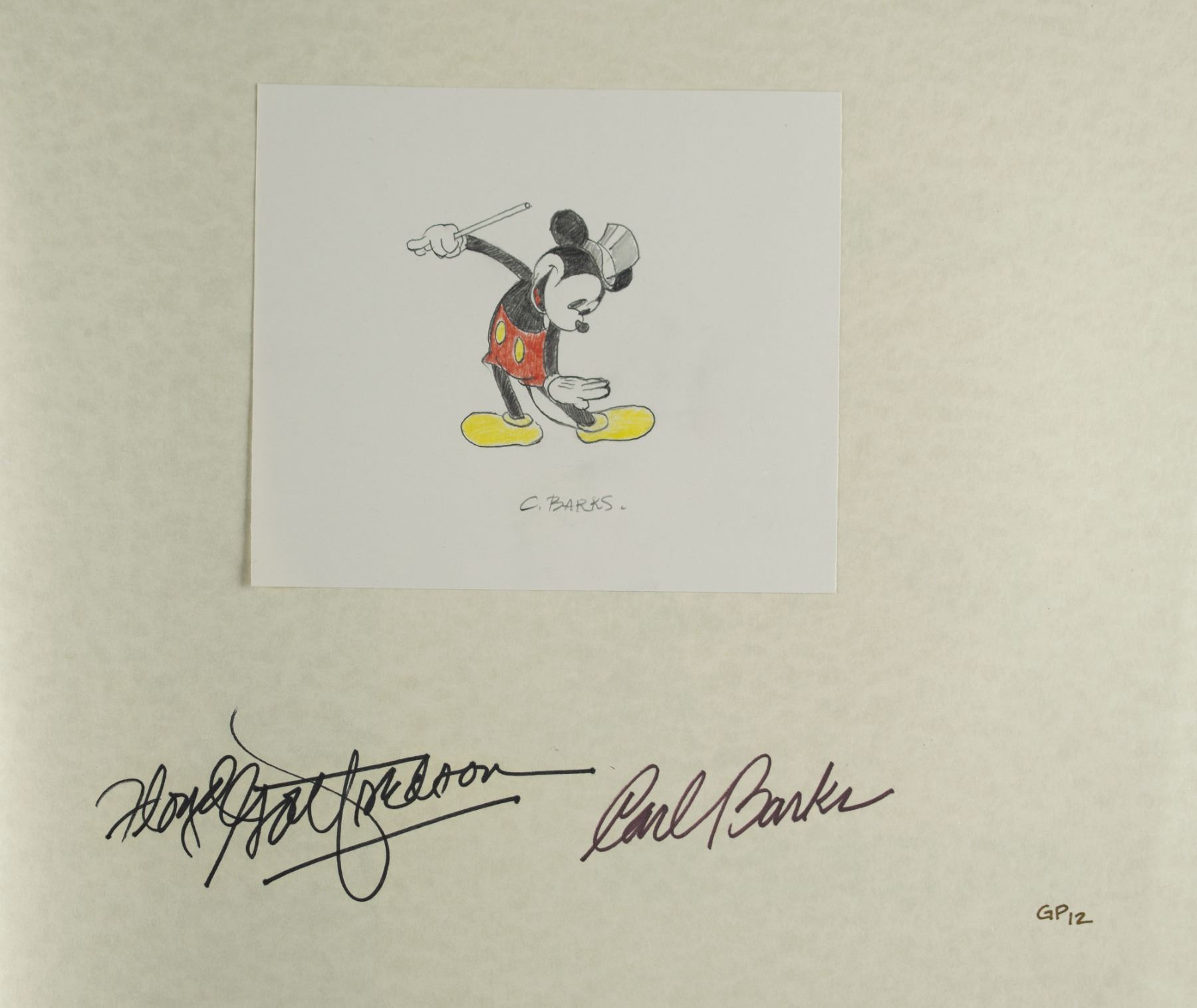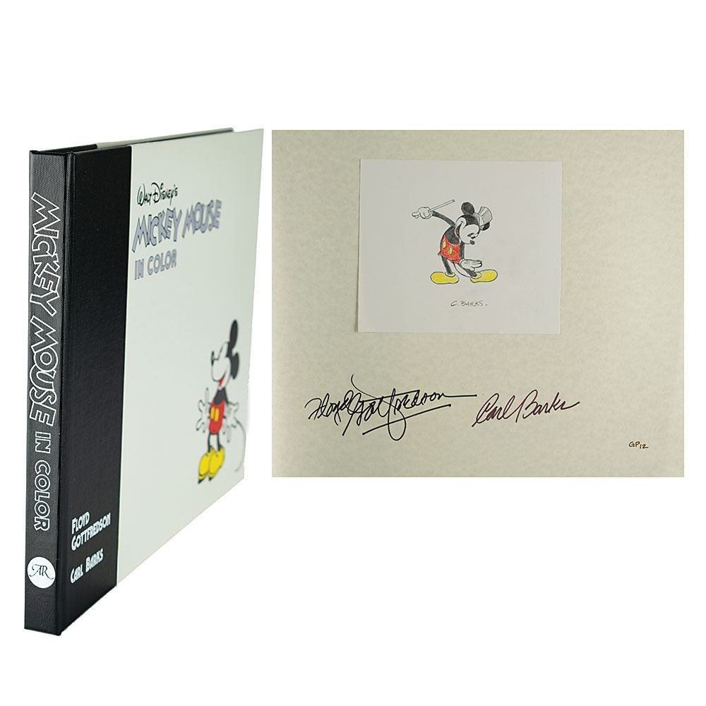 Signed book: Walt Disney's Mickey Mouse in Color. Limited Gold Plate Edition, numbered GP 12. Prescott, AZ: Another Rainbow Publishing, Inc., 1988. Hardcover, 17 x 13, 248 pages. Signed on an opening page in black felt tip by Carl Barks and Floyd Gottfredson. Included with the Gold Plate edition is an original sketch by Barks of Mickey Mouse with a baton and top hat, accomplished in graphite and colored crayon on an off-white 7 x 6 sheet, and signed below, "C. Barks." In fine condition. Accompanied by the original shipping box.
