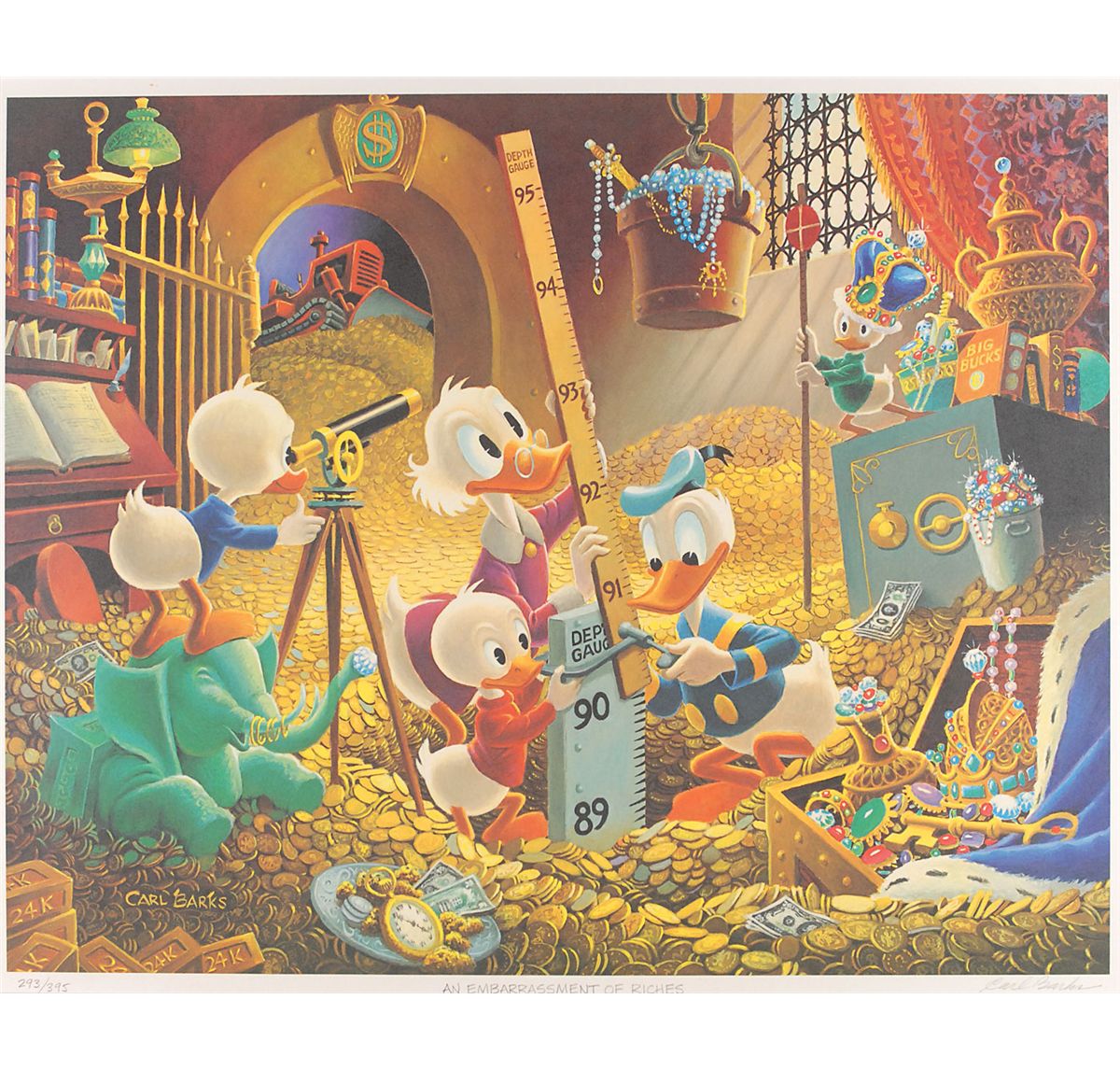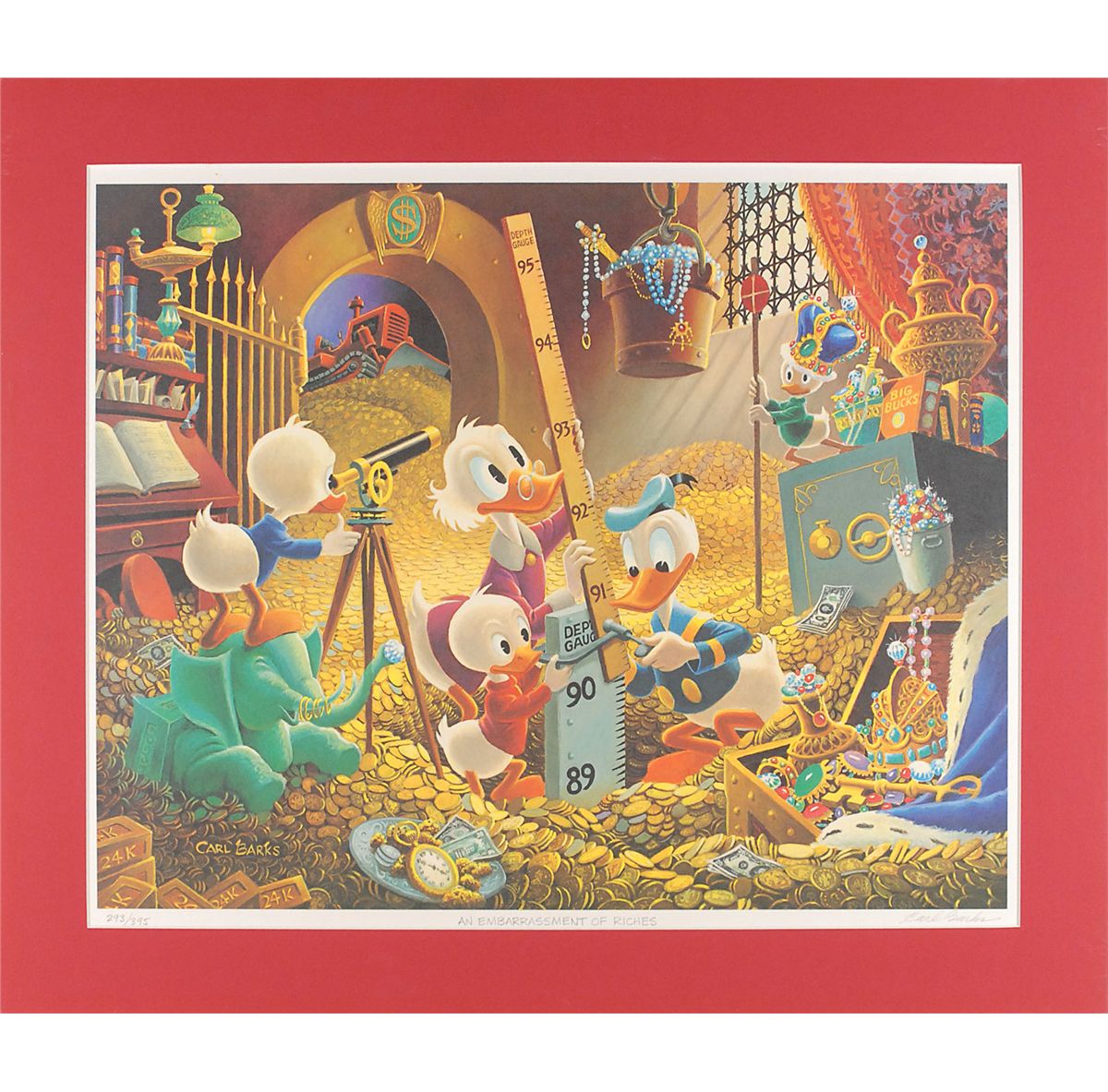 (Another Rainbow Publishing, 1983) Color limited edition 20.5 x 16.5 lithograph entitled ‘An Embarrassment of Riches,’ numbered 293/395, signed in the lower border in pencil. Scene shows Scrooge and Donald having to add an extension onto the depth gauge of Scrooge’s money cave. Matted to an overall size of 24.5 x 21. In very fine condition. Accompanied by a certificate of authenticity from Another Rainbow Publishing.