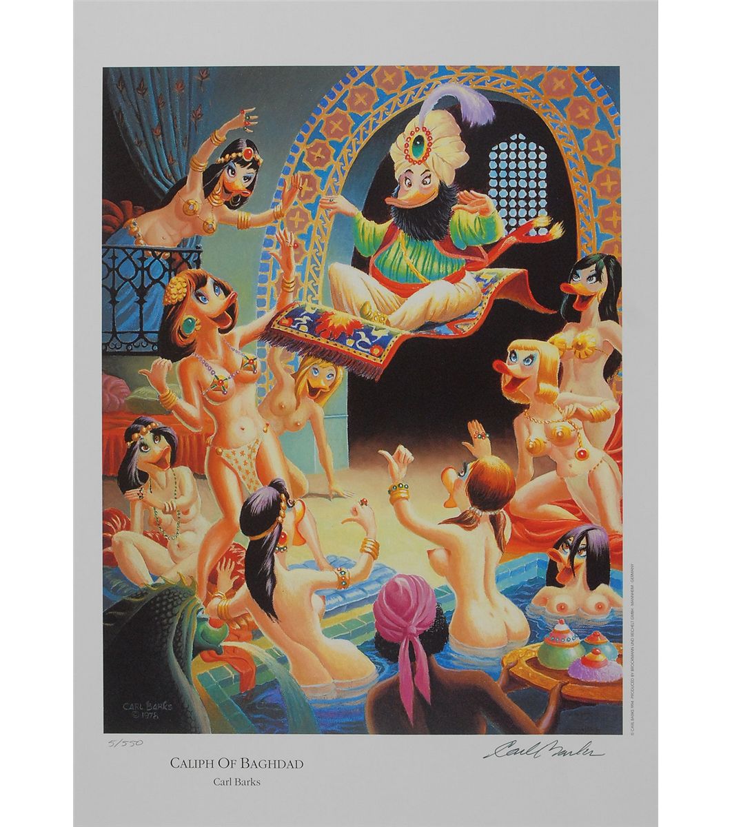 (Brockmann Publishing, 1994) Color limited edition 13.25 x 19 print entitled ‘Caliph of Baghdad,’ numbered 5/550, signed in the lower border in black felt tip by Barks. Scene shows Caliph arriving on his magic carpet to a room full of scantily-dressed and nude women. Barks Studio stamp on the reverse reads, “Famous figures of history as they might have looked if their genes had gotten mixed with those of waterfowl.” In very fine condition.