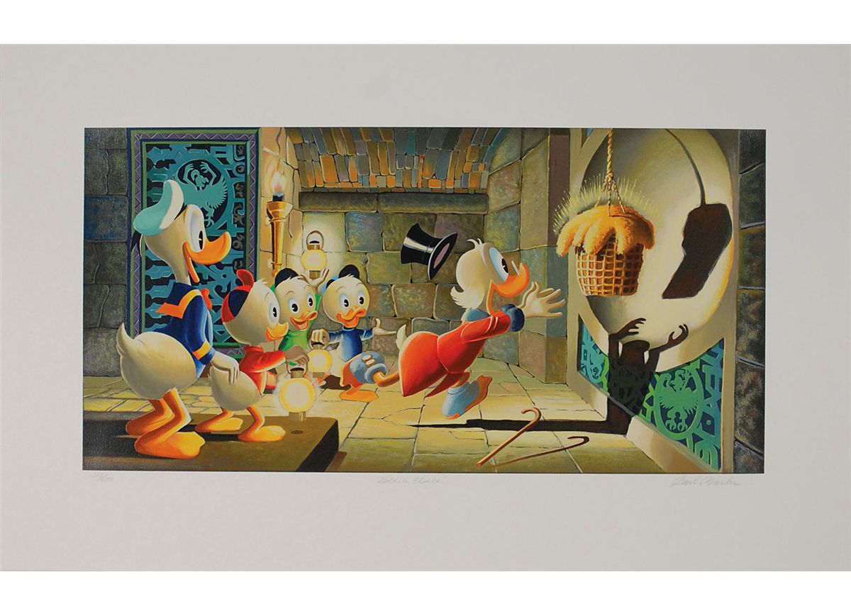 (The Walt Disney Company) Color limited edition 30 x 18.5 serigraph entitled ‘Golden Fleece,’ numbered 222/500, signed in the lower border in pencil. Scene shows Scrooge McDuck running for the golden fleece, which hangs in a temple basket. In fine condition. Accompanied by a certificate of authenticity from the Walt Disney Company.