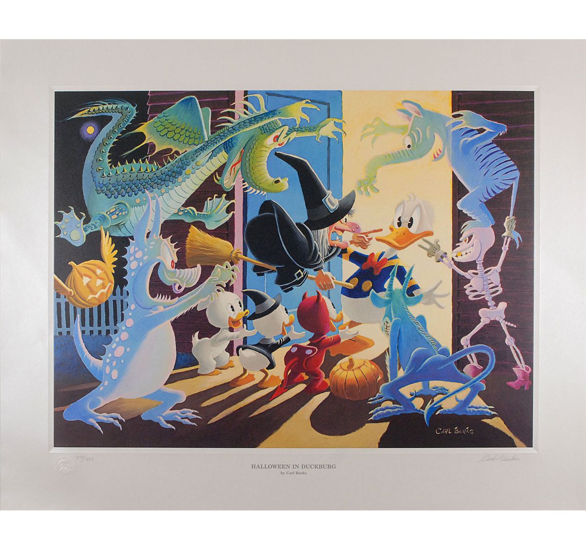(Another Rainbow Publishing, 1992) Color limited edition 27 x 22 lithograph entitled ‘Halloween in Duckburg,’ numbered 293/395, signed in the lower border in pencil. Scene shows Donald greeted at his door by his nephews and an assortment of ghosts and monsters. In very fine condition. Accompanied by a certificate of authenticity from Another Rainbow Publishing.