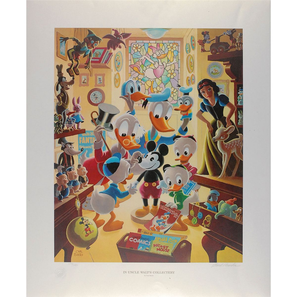 (Another Rainbow Publishing, 1984) Color limited edition 21 x 25.5 lithograph entitled ‘In Uncle Walt’s Collectory,’ numbered 139/345, signed in the lower border in pencil by Barks. Image shows Donald and his family in a treasure trove of Disneyana. In fine condition. Accompanied by a certificate of authenticity from Another Rainbow Publishing.