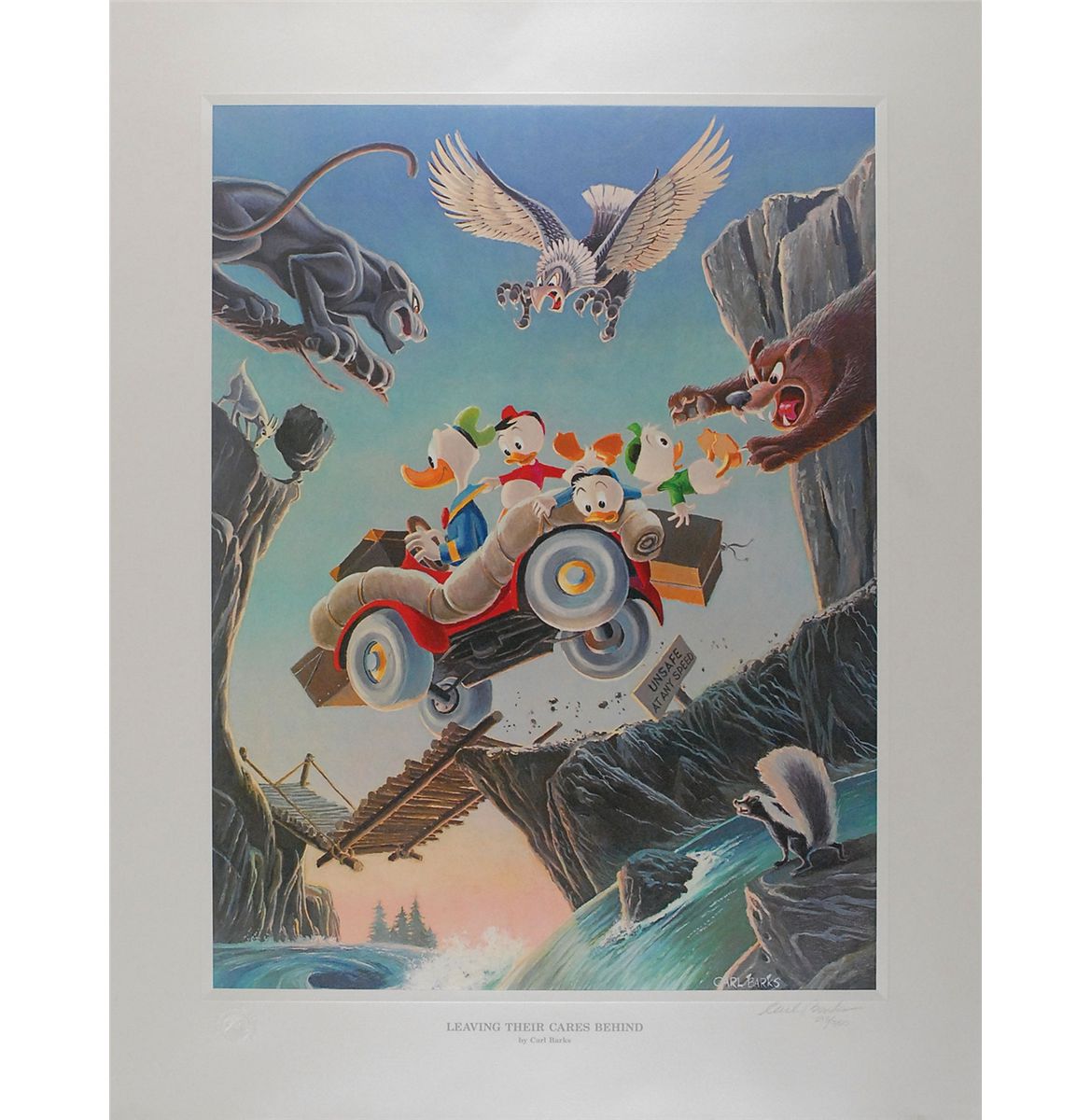(Another Rainbow Publishing, 1995) Color limited edition 20 x 25 lithograph entitled ‘Leaving Their Cares Behind,’ numbered 293/350, signed in the lower border in pencil. Scene shows Donald and his nephews in their Belchfire Runabout traveling an unsafe road and surrounded by dangerous animals. In fine condition. Accompanied by a certificate of authenticity from Another Rainbow Publishing.