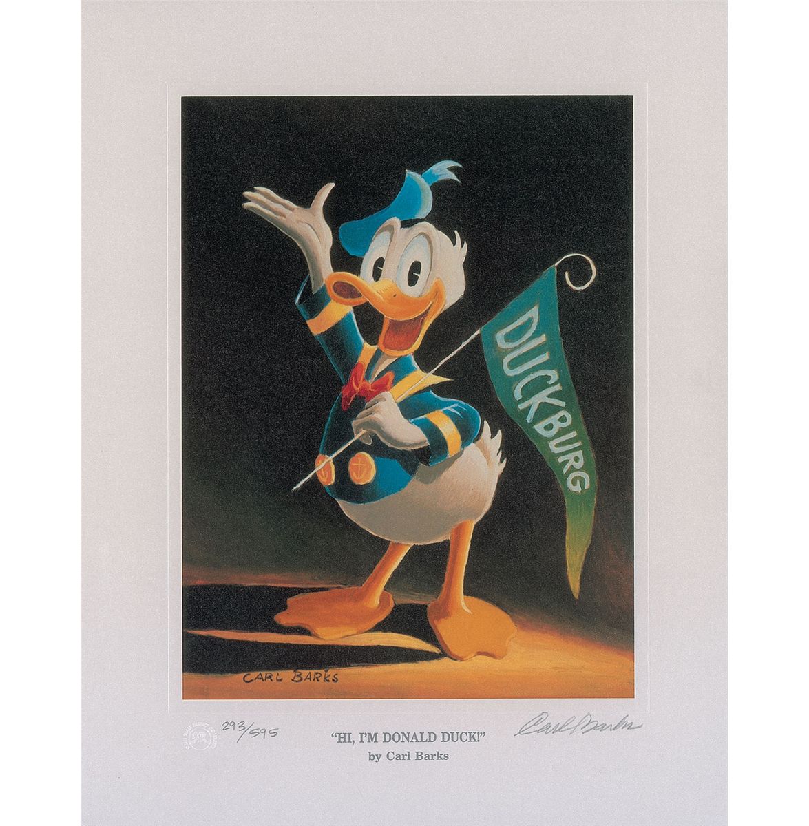 (Another Rainbow Publishing, 1994) Color limited edition 9.5 x 12 lithograph entitled ‘Sixty Years Quacking,’ featuring the original title of the oil painting ‘Hi, I’m Donald Duck,’ numbered 293/595, signed in the lower border in pencil. Full-length image of Donald holding a Duckburg pennant was originally done by Barks in honor of Donald’s 60th birthday. In fine condition. Accompanied by a certificate of authenticity from Another Rainbow Publishing.