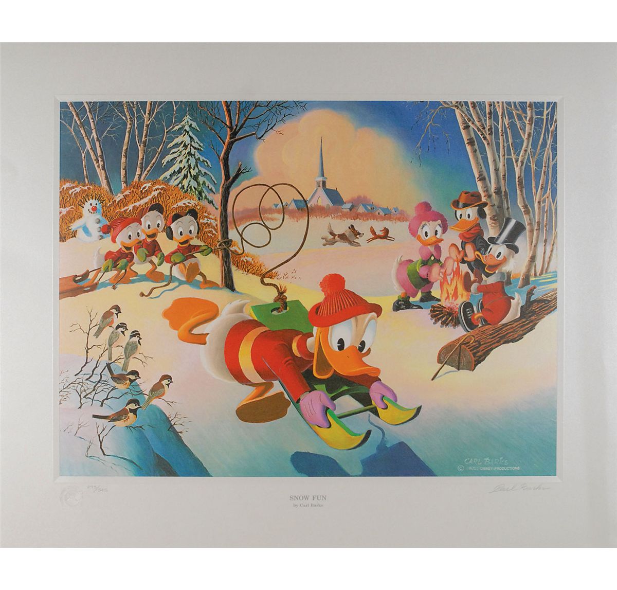 (Another Rainbow Publishing, 1990) Color limited edition 24.75 x 20.5 lithograph entitled ‘Snow Fun,’ numbered 293/345, signed in the lower border in pencil by Barks. Scene shows Donald’s nephews about to play a prank on their uncle by tying his sled to a lamp post. In very fine condition. Accompanied by a certificate of authenticity from Another Rainbow Publishing.