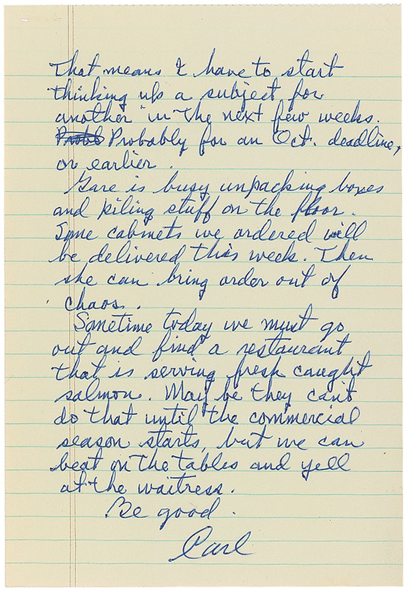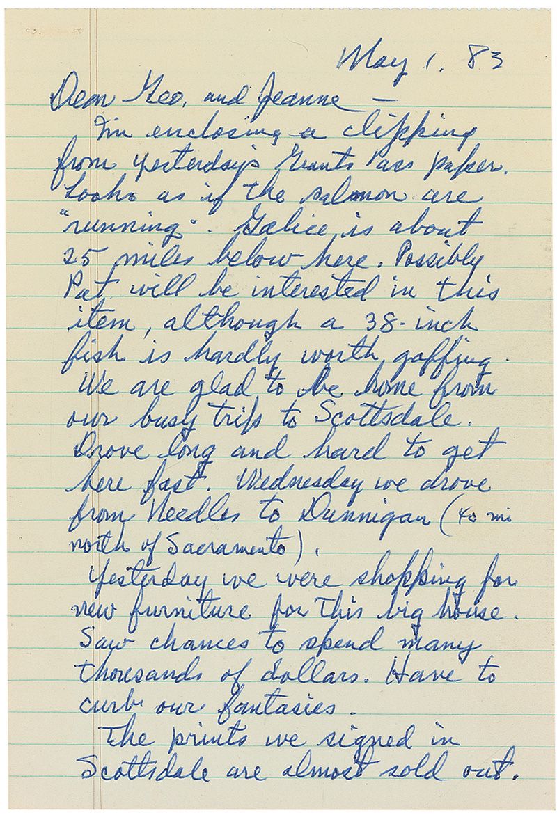 Legendary Disney artist (1901–2000) known as the ‘Duck Man’ for inventing ‘Duckberg,’ the home of Donald Duck, Scrooge McDuck, Huey, Dewey, Louie, and Daisy Duck. ALS signed “Carl,” two lined pages, 5 x 7.25, May 1, 1983. A letter to some friends about travel and his new house. In parts: “I’m enclosing a clipping from yesterday’s Grant Pass paper. Looks as if the salmon are ‘running.’…Yesterday we went shopping for new furniture for this big house. Saw chances to spend many thousands of dollars. Have to curb our fantasies…Gare is busy unpacking boxes and piling stuff on the floor. Some cabinet we ordered will be delivered this week. Then she can bring order out of chaos. Sometime we must go out and find a restaurant serving fresh caught salmon. Maybe they can’t do that until the commercial season starts, but we can beat on the tables and yell at the waitress.” In fine condition, with a few light creases and staple holes to the upper left corner.