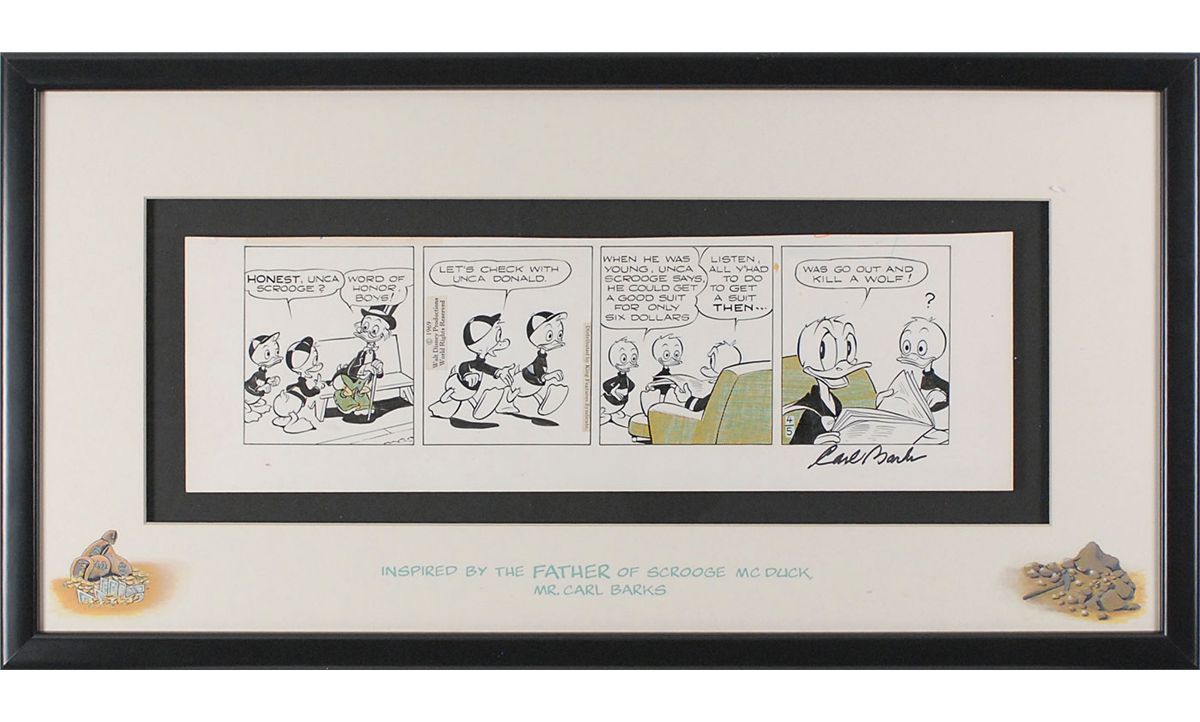 Original hand-inked four-panel Scrooge McDuck daily comic, dated April 5, 1969, drawn by a Disney artist, on a 21 x 6.5 sheet of off-white artist’s cardstock, signed in the lower border in black felt tip by Barks. Nicely matted and framed to an overall size of 30.5 x 15.75. In fine condition. Accompanied by a certificate of authenticity from Walt Disney Art Classics.
