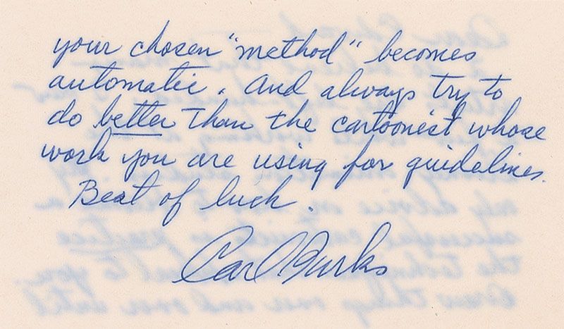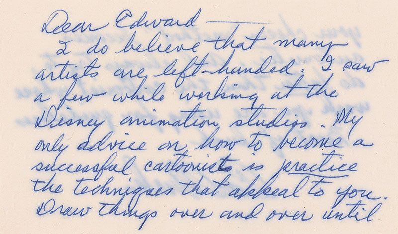 Fantastic ALS, one page both sides, 5 x 3, no date. Letter to an admirer. In full: “I do believe that many artists are left-handed. I saw a few while working at the Disney animation studios. My only advice on how to become a successful cartoonist is practice the techniques that appeal to you. Draw things over and over until your chosen ‘method’ becomes automatic. And always try to do better than the cartoonist whose work you are using for guidelines.” In fine condition, with show-through from writing to opposing sides.