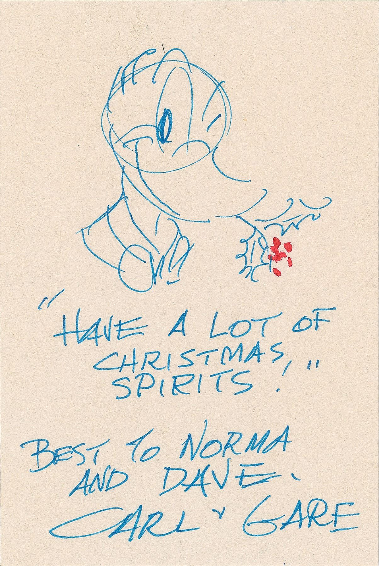 Original felt tip sketch of Donald Duck with mistletoe in his beak accomplished by Barks on an off-white 4 x 6 sheet, signed and inscribed below, "'Have a lot of Christmas spirits!' Best to Norma and Dave, Carl & Gare." In fine condition. Accompanied by an autograph letter signed by his wife, Gare Barks, extensively discussing the history and sale of prints of Barks's artwork, with its original mailing envelope.