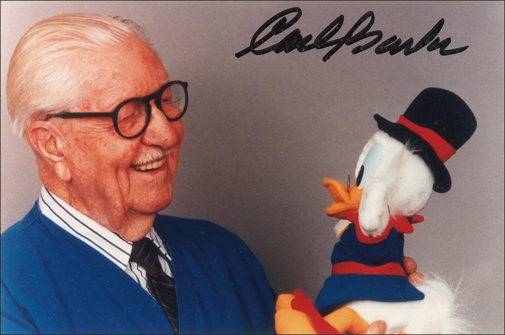 Color glossy 6 x 4 photo of Barks holding a stuffed Donald Duck doll, signed in black felt tip. In fine condition. Pre-certified PSA/DNA and RRAuction COA.