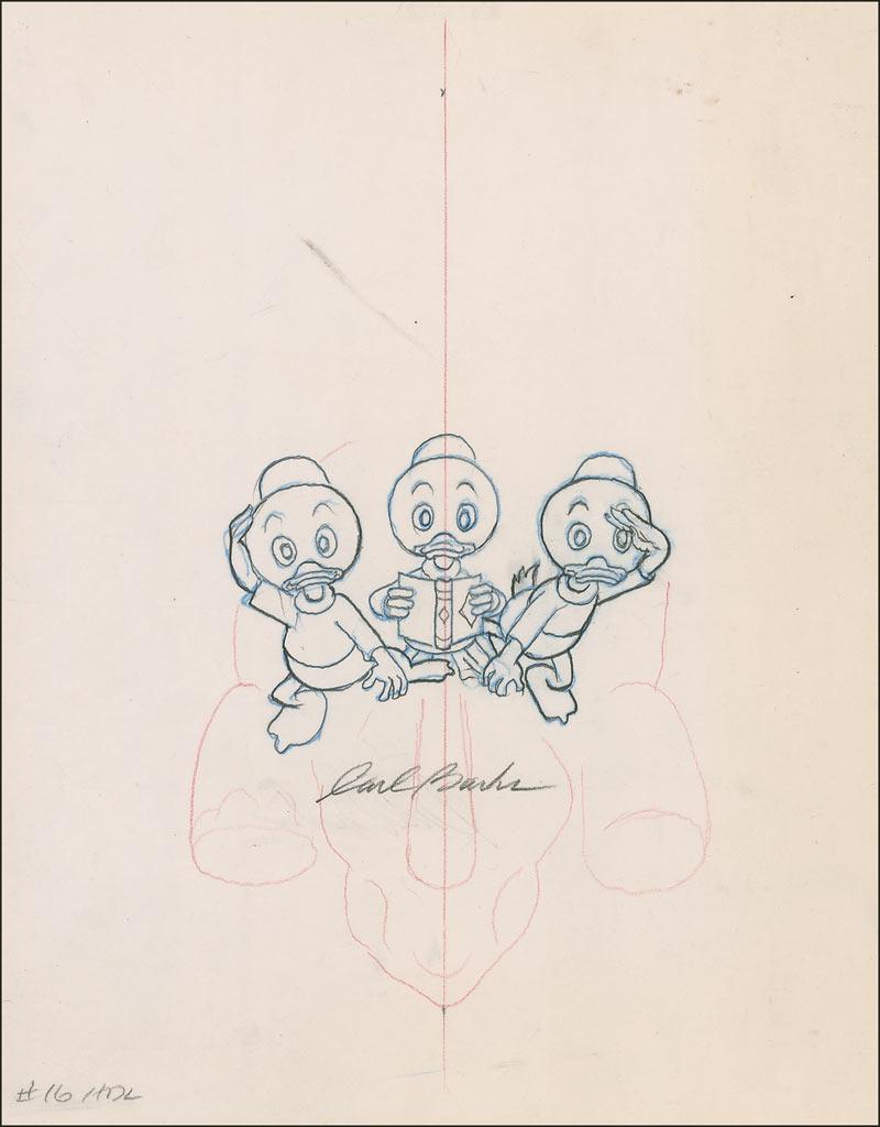 Original signed pencil sketch of Huey, Duey, and Louie on an off-white 11 x 14 sheet of heavy tracing paper, originally done for the ‘Far Out Safari’ figurine. In fine condition. Accompanied by a 1997 letter from Kathy Morby from the Carl Barks Studio stating, “In this drawing, Carl was trying to draw all the boys…in the round.”