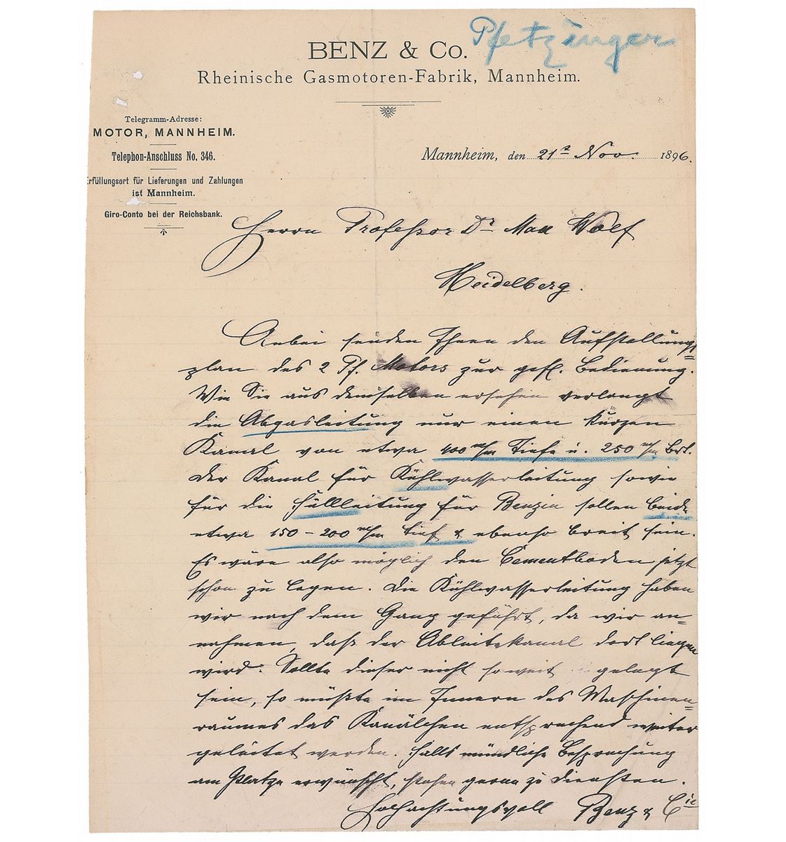 Rare ALS in German, signed “Benz & Cie.,” one page, 8 x 11, Benz & Co. letterhead, November 21, 1896. Letter to the German astronomer Max Wolf, a pioneer in the field of astrophotography, about sending him the construction plans for an engine and offering further details on the project, in part (translated): “Herewith please find the layout chart for the 2 HP motor. From this you will see that the exhaust gas line is requiring only a short channel of about 400 mm depth and 250 mm width. The channel for the cooling water pipe as well as for the filling line for gasoline shall be appr. 150-200 mm deep and wide. So it would be possible to start laying cement floors.” Crease passing through a portion of his signature, a few office notations, small holes to upper left, and slightly trimmed edges, otherwise fine condition. An extremely boldly penned and attractive letter.