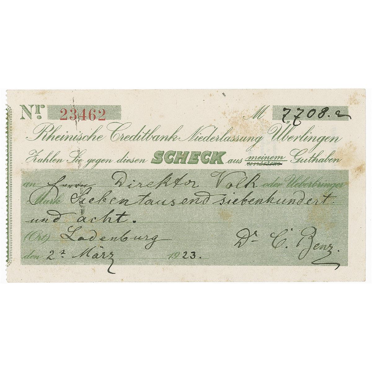 German engineer (1844–1929) who, after graduating from the University of Karlsruhe at the age of 19, went on to develop one of the first practical internal combustion engines, revolutionizing the history of the automobile. The company he founded, Mercedes-Benz, remains one of the most prestigious names in the industry. Rare bank check, 5.5 x 3, filled out and signed “Dr. C. Benz,” payable to Director Volk for 7.708 German marks, March 2, 1923. In fine condition, with scattered foxing/soiling impinging but not touching the signature. Any autographed material from Benz is extremely elusive.