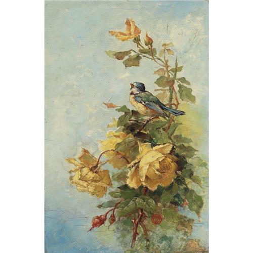 Carl Bonfig (American, early 20th century ), Bluebird and Roses, c.1920;oil/canvas laid down on board,18in. x 12in., signed with monogram.St. Louis painter.