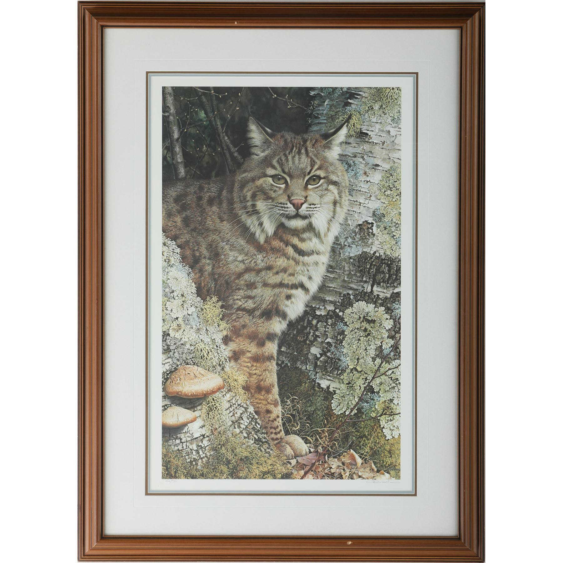 Carl Brenders' "Forest Sentinel - Bobcat" limited edition print, signed and numbered 662/950. This piece has been professionally triple matted, and custom framed under glass. Image- 26" x 16". Frame- 37 1/2" x 27 1/4".