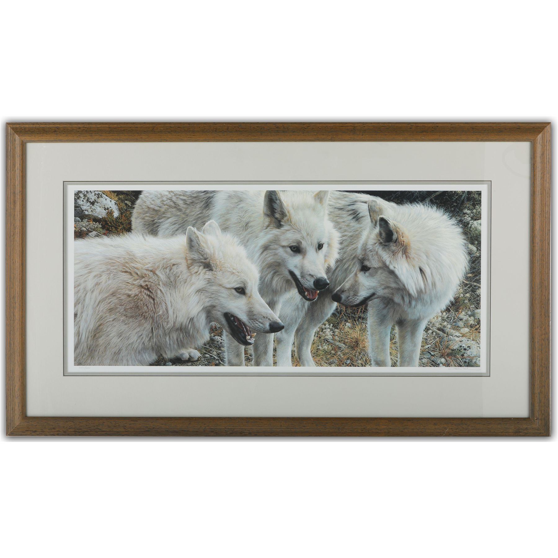 Carl Brenders' "Tundra Summit - Arctic Wolves" limited edition print, signed and numbered 5661/6061. This piece has been professionally triple matted, and custom framed under glass. Image- 15" x 34 1/4". Frame- 27" x 46 1/2".