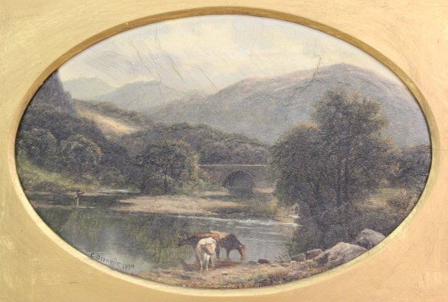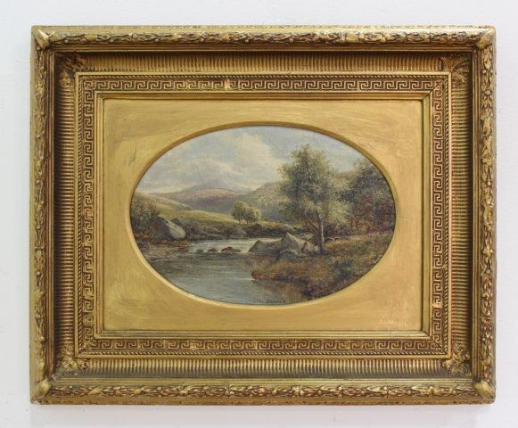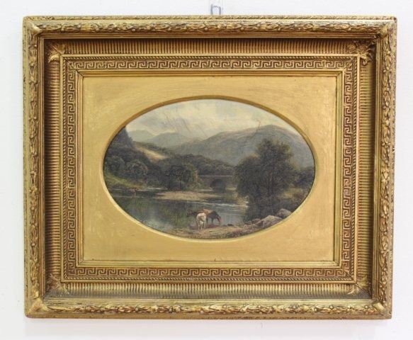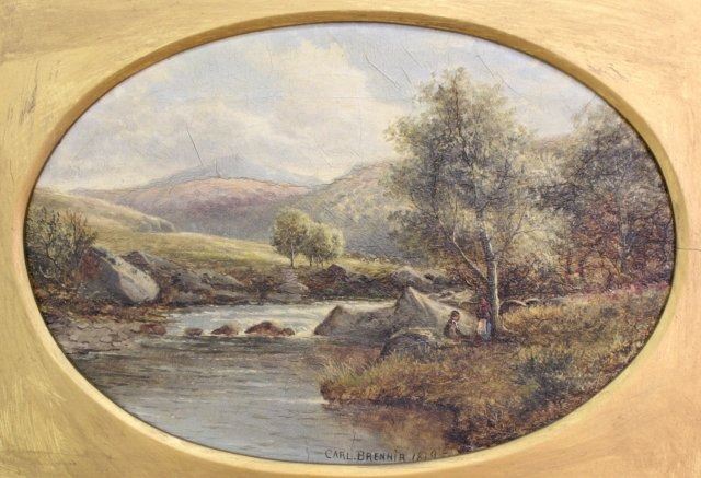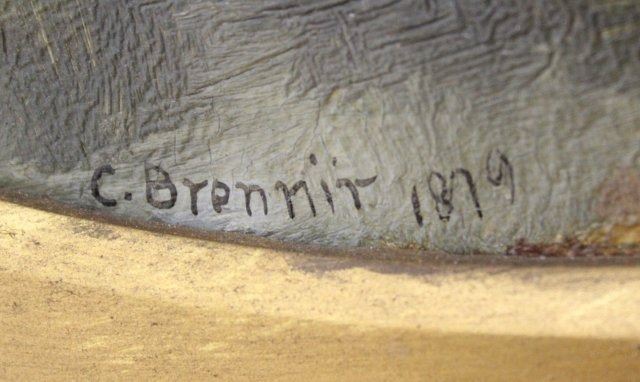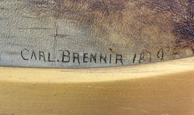 Oil on canvas. Signed and dated 1879. Carl Brennir (1850-1920). Approx. 10" H x 15" W sight, 21" H x 26" W. Crazing to canvas.