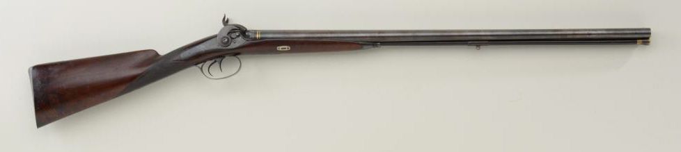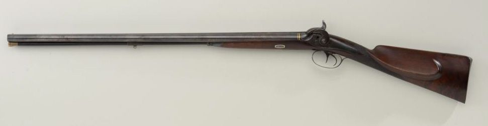 Carl Delp in Darmstadt-made SxS percussion fowler, approx. 16 gauge, 28” barrels, damascene finish on barrels, back action locks, circa 1850’s-1870’s, good bores and actions, checkered wood half stock in overall very good condition showing some slight cracks and scattered old mars from storage; gold bands on breech area of barrels; a high quality fowler by a known maker and with original brass tipped wood ramrod. Est.:$600-$1,200.