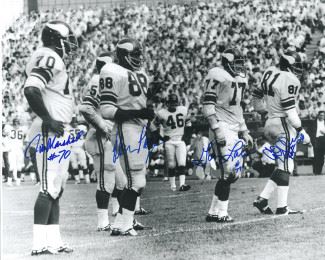 The Purple People Eaters was the nickname of the Minnesota Vikings football team's defensive line of the late 1960s to the late 1970s, when the Vikings played in four Super Bowls. The Purple People Eaters are Alan Page (9 Pro Bowl Selections, NFL MVP, and Hall of Famer), Carl Eller (6 Pro Bowl Selections and Hall of Famer), Jim Marshall (2 Pro Bowl Selections), and Gary Larsen (2 Pro Bowl Selections) The Purple People Eaters were a big factor in the post-season success of the Vikings from the late 1960s through the 1970s. This Minnesota Vikings 16X20 photo was hand signed by the Purple People Eaters: Carl Eller (with HOF 04 inscription), Alan Page, Jim Marshall, and Gary Larsen. Certificate of Authenticity from Athlon Sports.