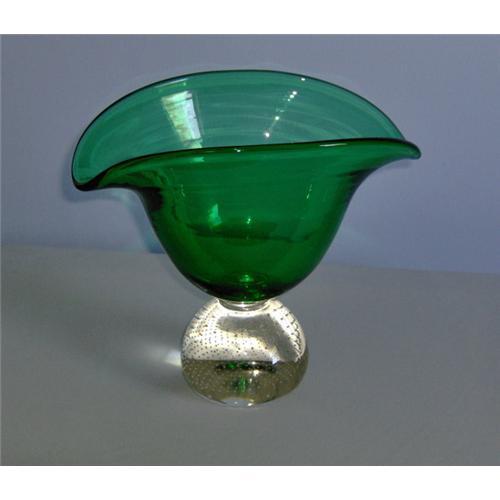 And then third, the internal textures of the glass are different. The fan is a smooth, stunning emerald green?and the base is given the signature Erickson controlled bubbles?here, very small and very symmetrical. They are laid out within a grid and appear to be a net of bubbles suspended within the larger bubble of the base. The crystal glass of the base shines and shimmers with its bubbles within the bubble form.<p>