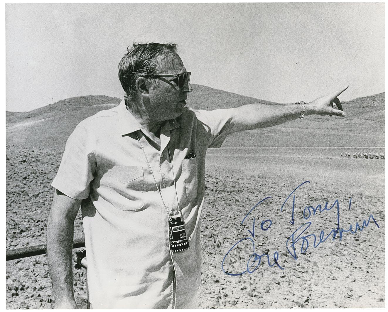 Screenwriter and film producer (1914–1984) who was blacklisted by the Hollywood movie studio bosses in the 1950s. Glossy 10 x 8 photo of Foreman on a movie set, signed and inscribed in fountain pen “To Tony, Carl Foreman.” In fine condition, with scattered bends and a few spots to the emulsion.