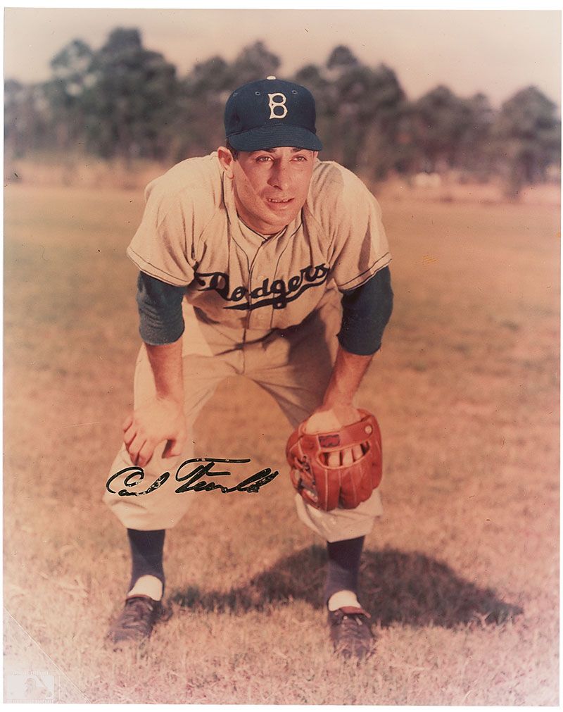 Color glossy 8 x 10 photo of Furillo in his Dodgers uniform, signed in black felt tip. A couple light bends and creases and some irregular adhesion to a few strokes of signature, otherwise fine condition.