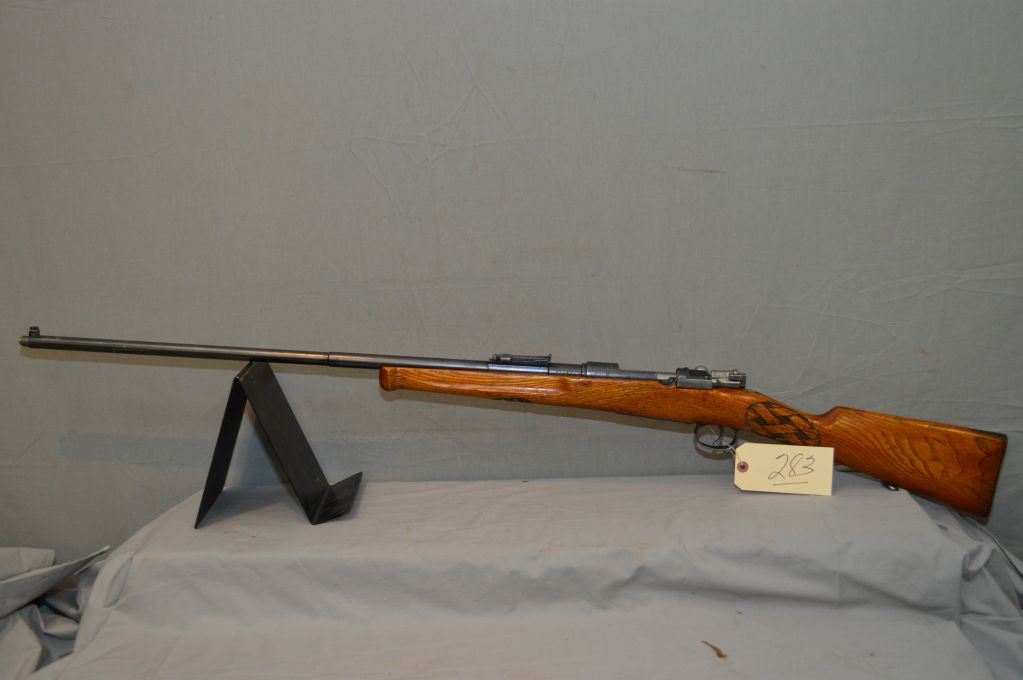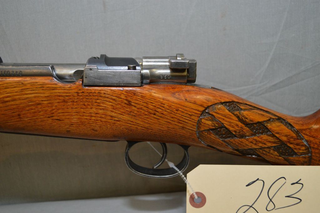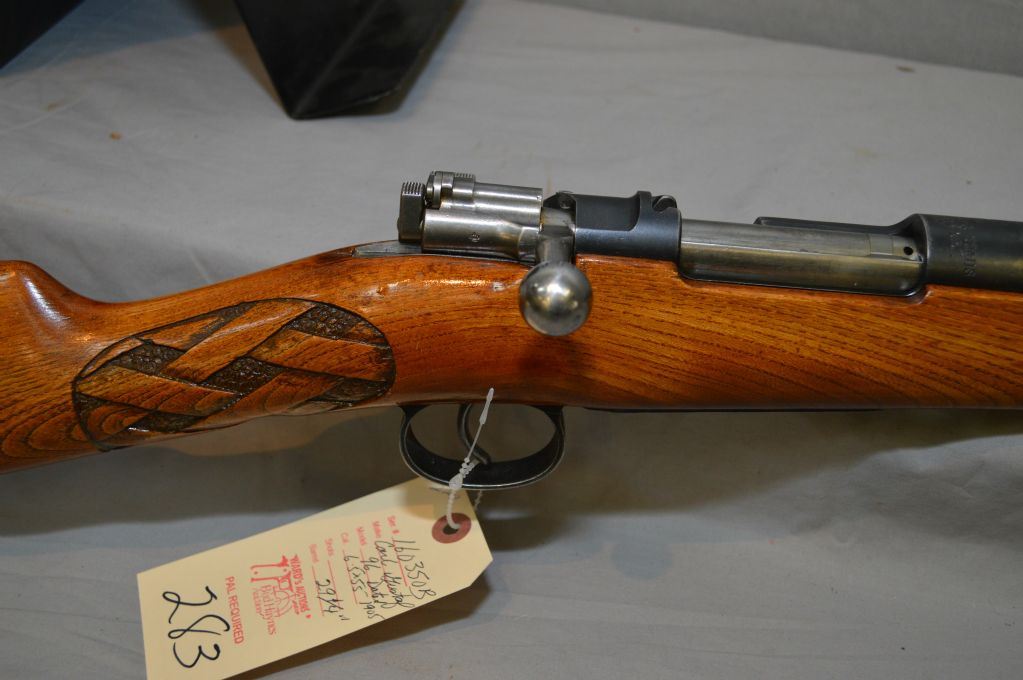 Carl Gustaf Model 96 Dated 1905 6.5 x 55 Swedish Mauser cal Bolt Action Rifle w/ 29 1/4" " [ blued finish, barrel sights, sporterized stock, which has wooden insert where brass plate was, basket weave hand carved grip, oak leaf carved forend ] Ser # 160350B
