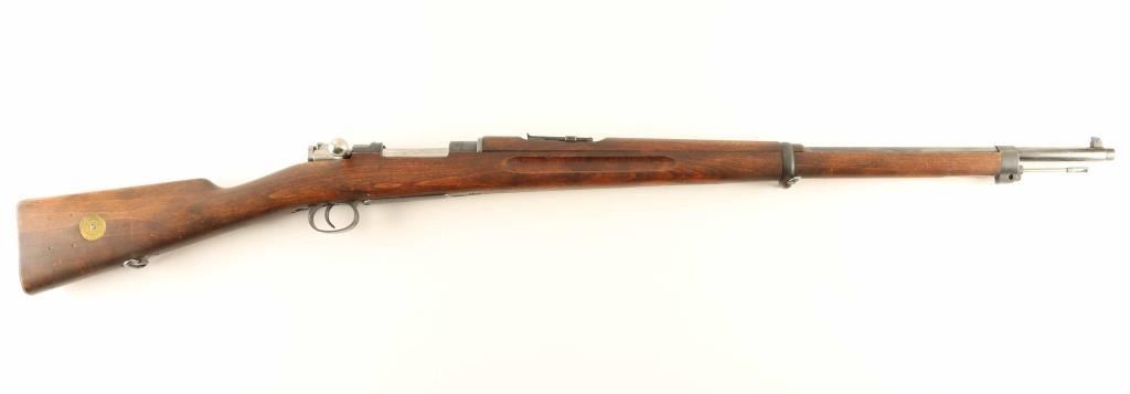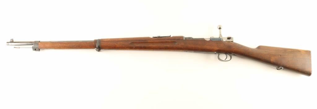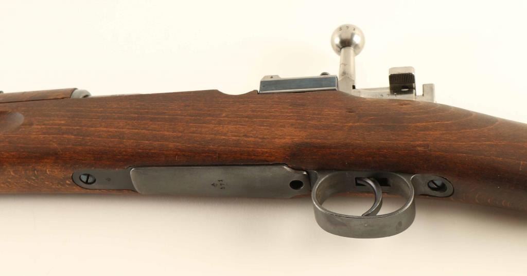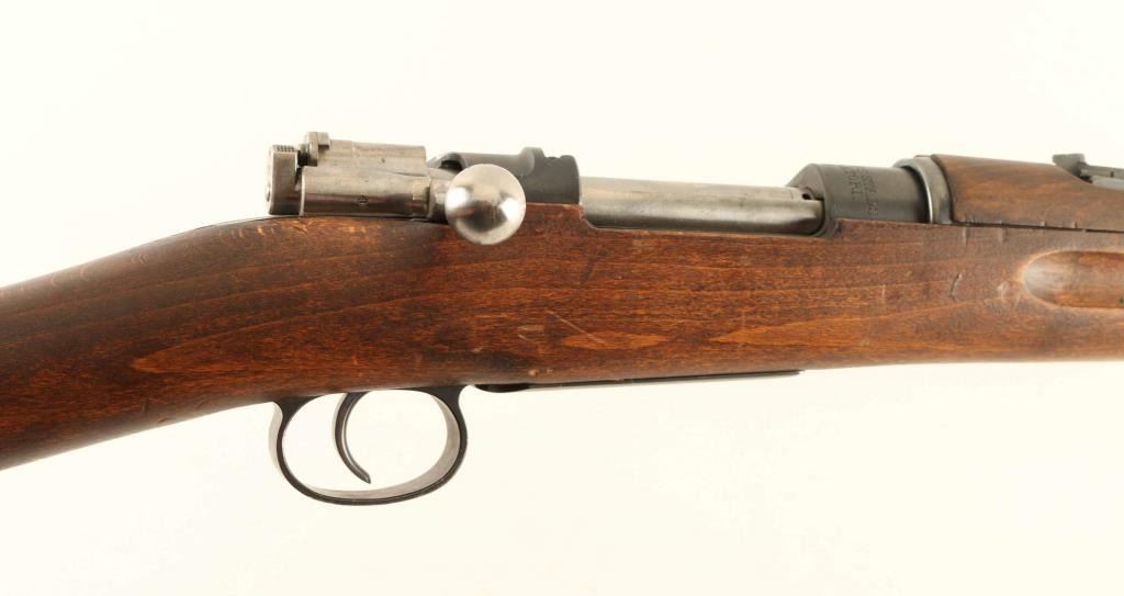 Swedish military bolt action service rifle chambered in 6.5x55mm Swedish, manufactured circa 1919. Imported by C.A.I. of St. Albans, V.T. with import marks on the right side of the barrel. Features a blued finish, 29" barrel, dovetailed blade front sight, flip-up ladder rear sight graduated to 2,000 meters, bayonet lug, cleaning rod, rounded trigger, polished bolt with straight handle & three position safety on the rear, 5 round internal box magazine, smooth wood handguard and full-length straight grip shoulder stock with sling swivels, brass stock disc & smooth metal buttplate. Serial numbers match on receiver, bolt(in four places), bolt catch, floorplate, rear sight(in three places), barrel bands & buttplate with another number observed on the cleaning rod. Rifle retains approximately 90% of it's matte blued finish showing light wear, scattered scratches and some niter blued screws & small parts. The stock disk is marked 6.50mm bore diameter, #1 bore condition and 0 holdover. Action is smooth, the bore is excellent and wood stocks are very good+. Condition is NRA Very Good. ***C&R Firearm***