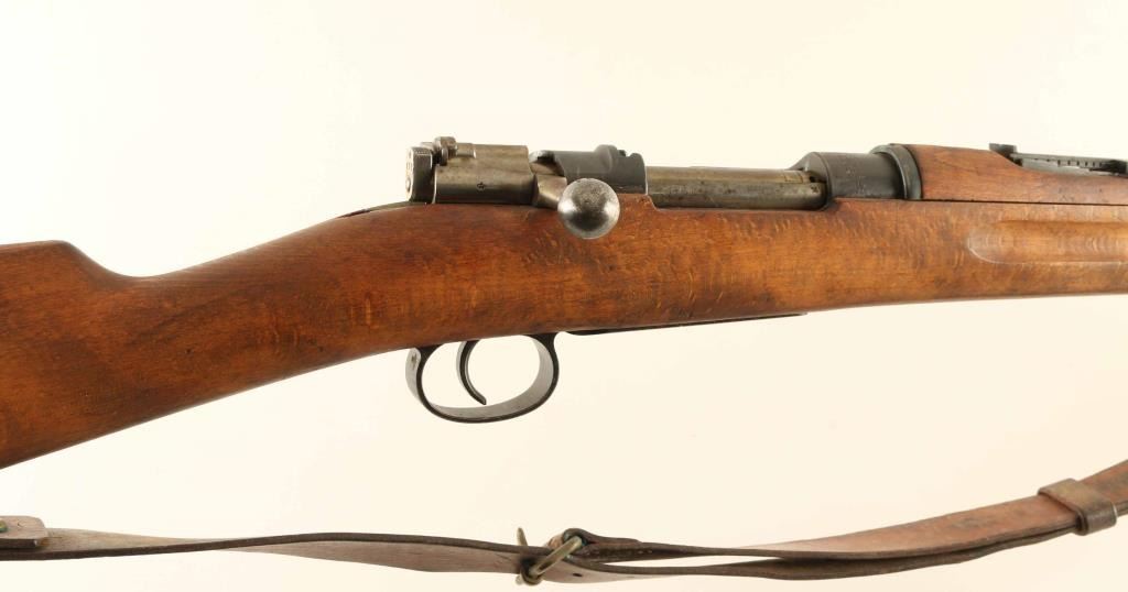 Swedish military bolt action rifle imported by CAI, St Albans VT. Features 29" barrel, cleaning rod, bayonet lug, post front sight, tangent rear sight with flip-up ladder, straight bolt handle, manual safety, sling swivels. Muzzle is not threaded. Bore is very good or better condition. Retains 75% blued finish, bare metal on edges and corners and where handled. Bolt is in the white. Stock is good to very good condition with dents and small gouges & nicks. Bands and bolt body numbered "413", other bolt parts re-stamped "413" over previous numbers. Includes good condition leather sling. Condition is NRA Good++ *** C&R Firearm ***