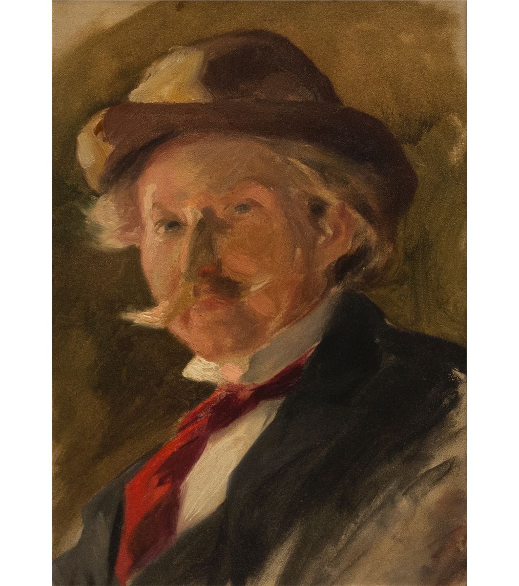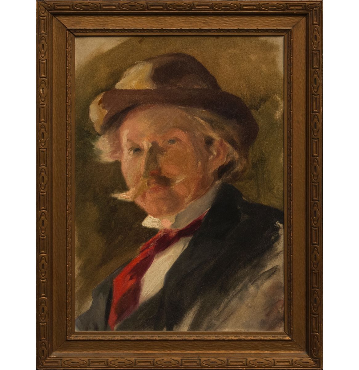 Carl Gustafson Lotave (1872 - 1924). Self Portrait. 17.75" x 11.75" oil on board. Unsigned, label verso: Self-Portrait, oil on board by Carl Gustafson Lotave (1872 - 1924), Bethany Faculty (Art) 1890s (1897-1899), Gift to Bethany College from Alba Malm Almquist, Aug. 1985. Provenance: Bethany College, Lindsborg, KS.