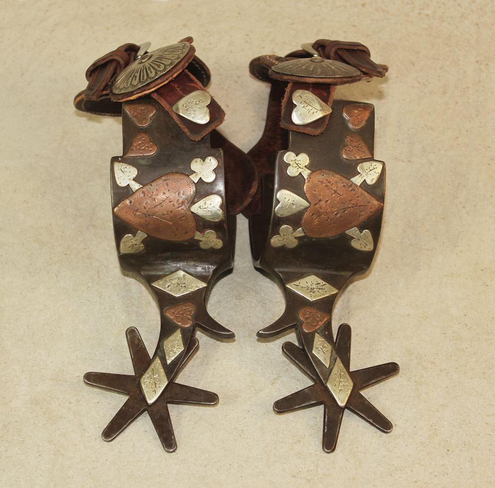 Amazing huge pair of single mounted Hall's that he patterned from an actual pair of JO Bass spurs. With extra wide heelbands and fantastic card suit design. Very attractive pair of two-tone spurs that will be rising in value.