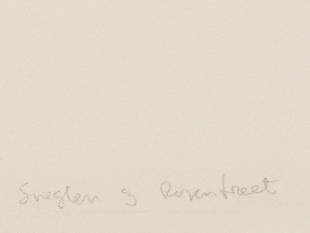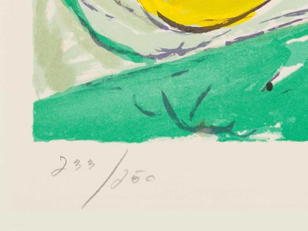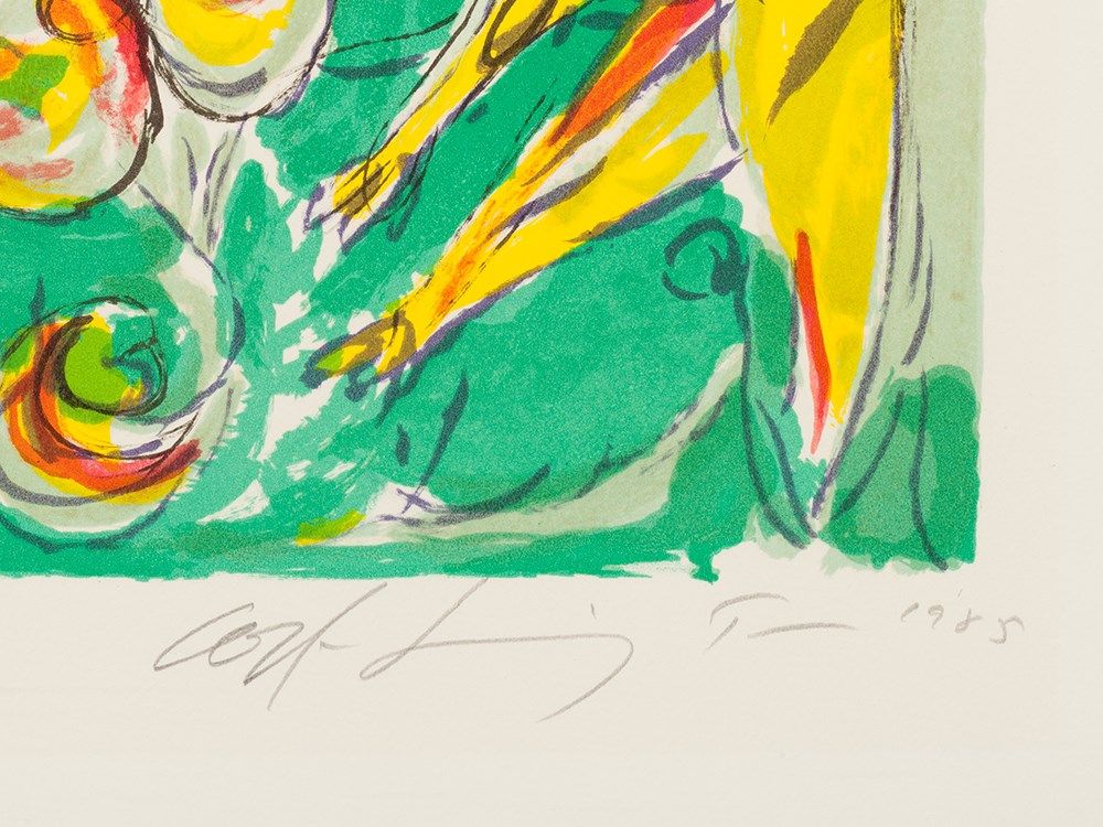 The color lithograph is signed and dated lower right in pencil ‘Carl-Henning Pedersen 1985’ and numbered lower left in pencil ‘233/250’. The sheet is mounted under a mat at the reverse upper sheet edges and is in very good condition. The frame shows slight signs of wear. The image measures 52.6 x 52.7 cm, the sheet 76.2 x 56 cm. The framed dimensions are 80.5 x 66 cm