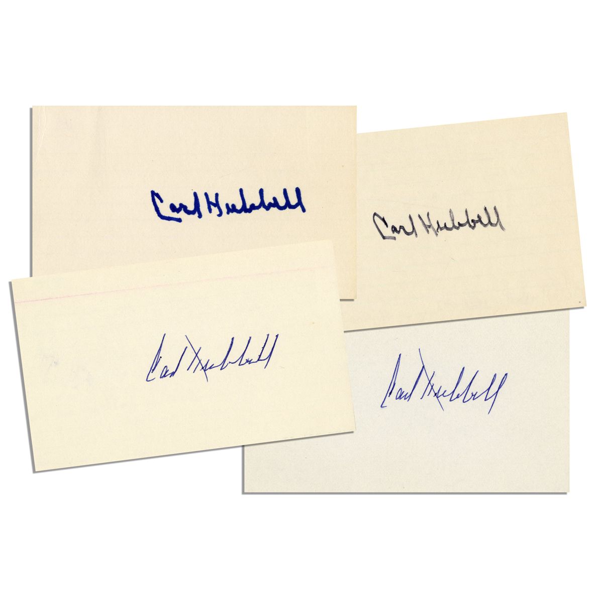 Lot of Four Cards Signed by Baseball Hall of Famer Carl Hubbard -- Cards Each Measure 5'' x 3'' -- Signed in Blue Ink, Black Marker & Blue Marker -- Fine