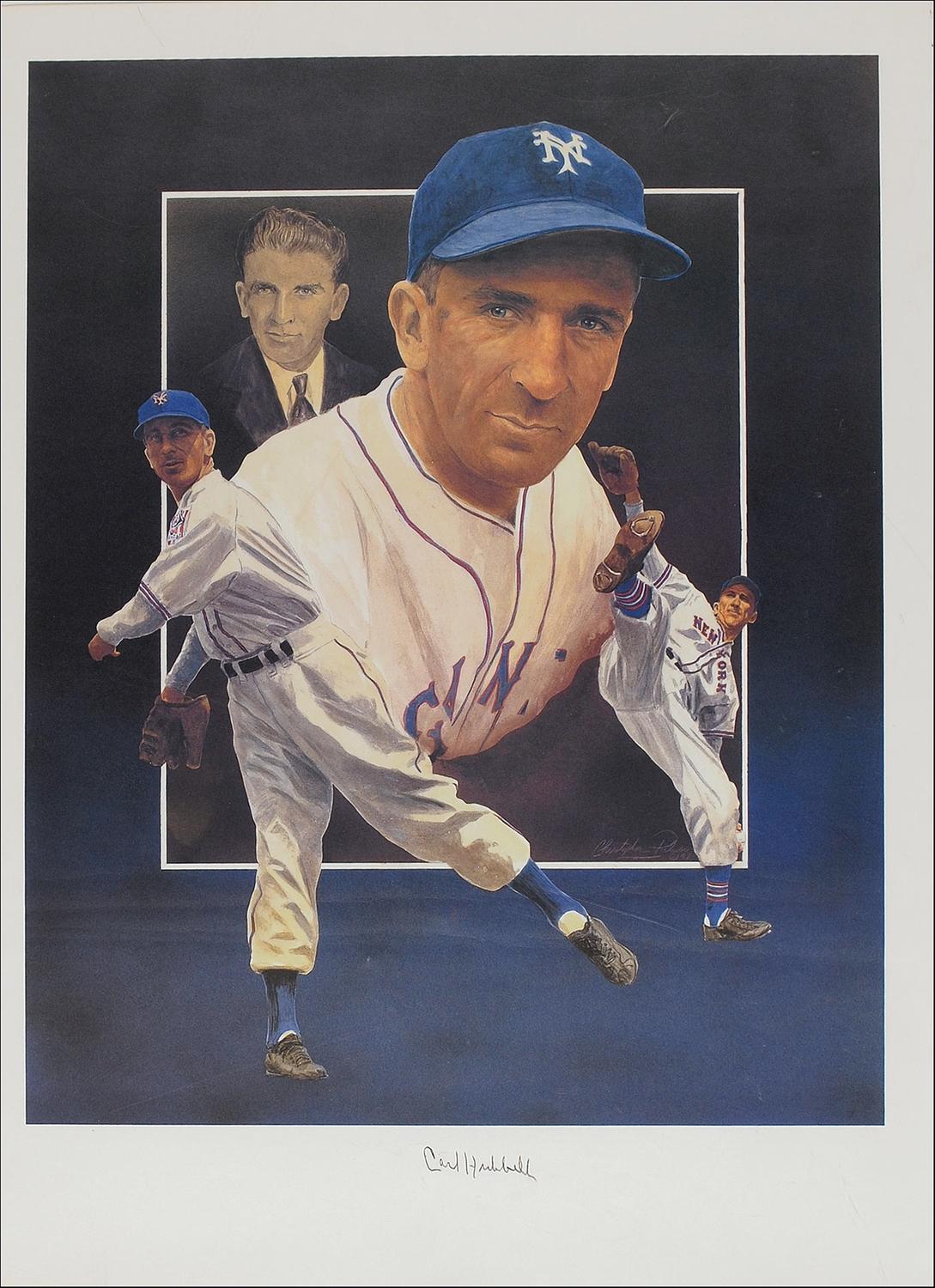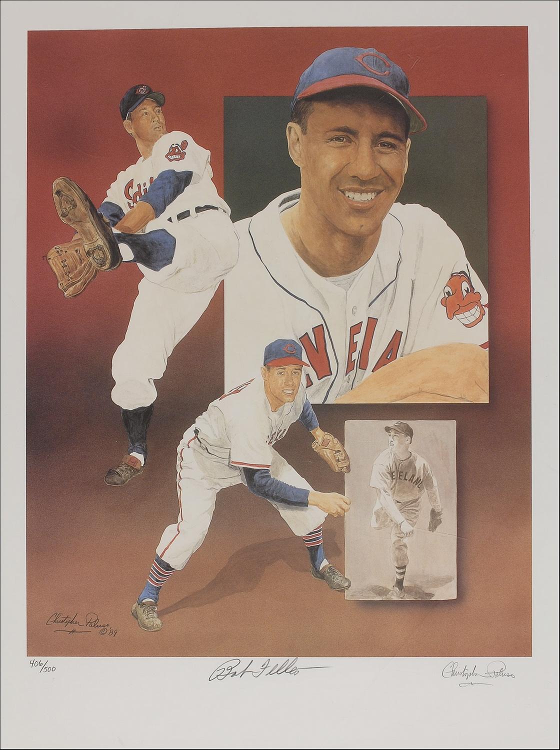 Two color 18.5 x 24 Christopher Paluso prints, individually signed in pencil by Carl Hubbell and Bob Feller. Feller’s poster is also signed in pencil by the artist with a limited edition notation “406/500.” Rolled. Scattered mild creasing, otherwise fine condition.