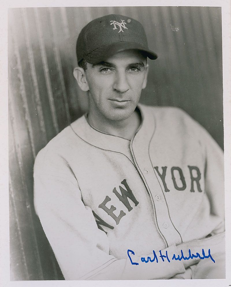 Glossy 8 x 10 photo of Hubbell in his New York Giants uniform, signed in blue felt tip. In fine condition.