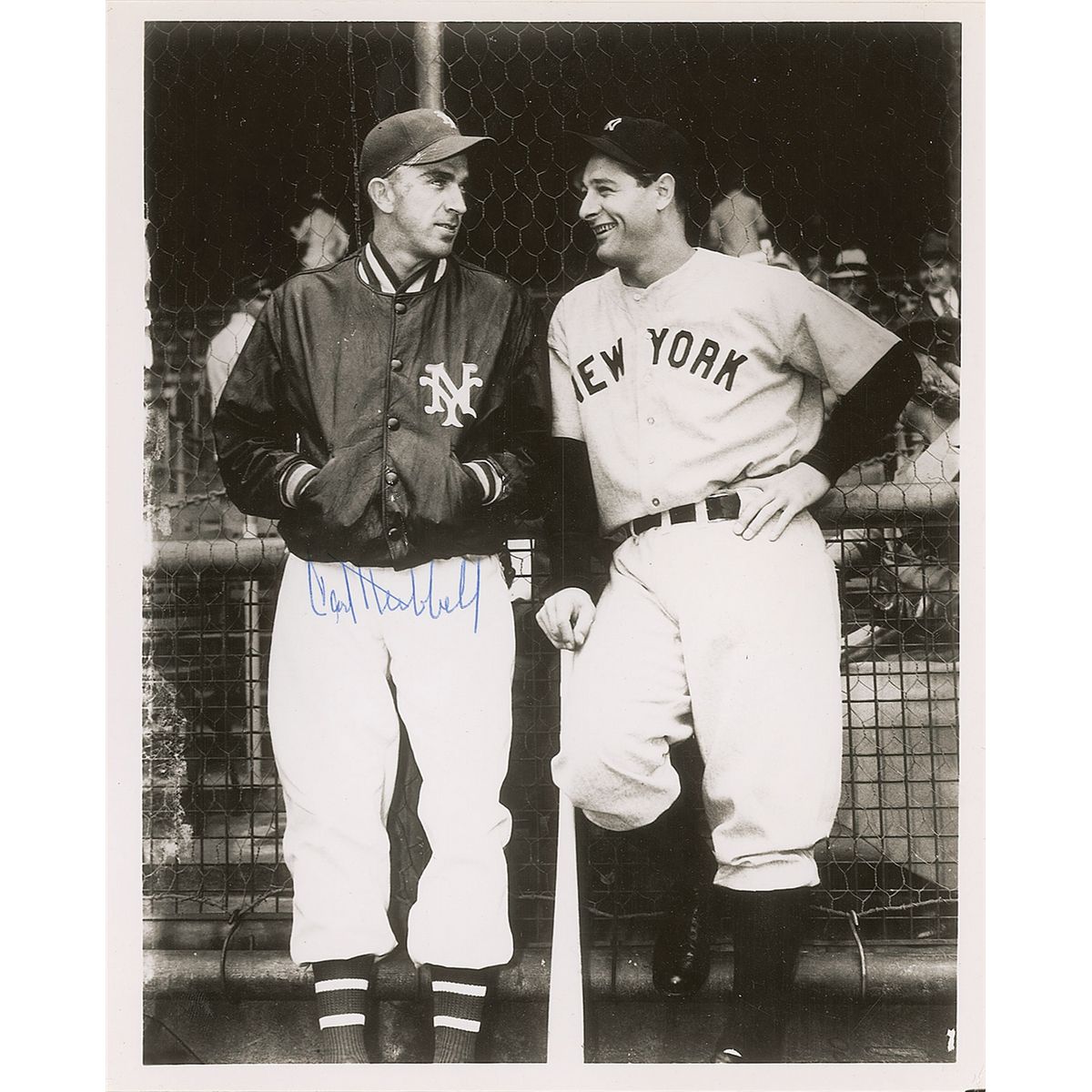 Glossy 8 x 10 photo of Hubbell with crosstown rival Lou Gehrig, signed in blue ballpoint. In fine condition, with scattered creases.