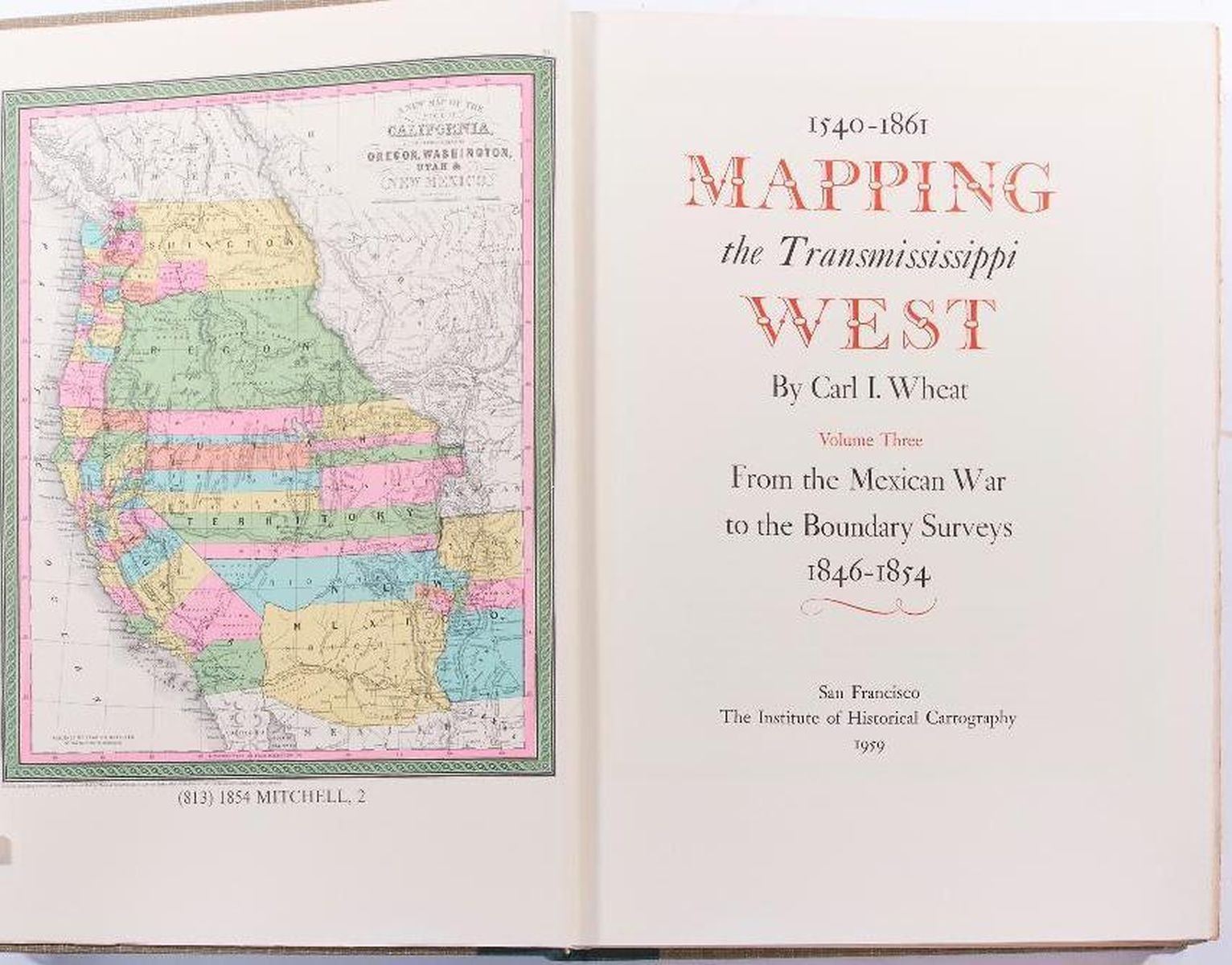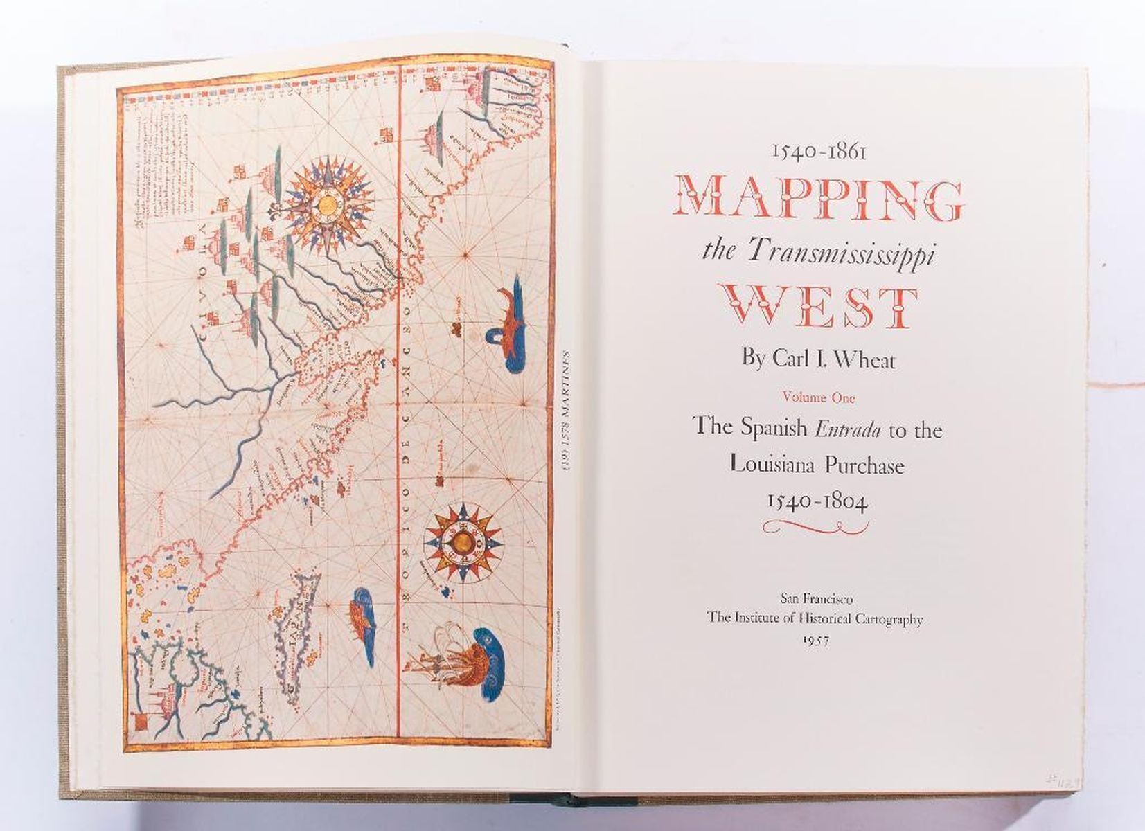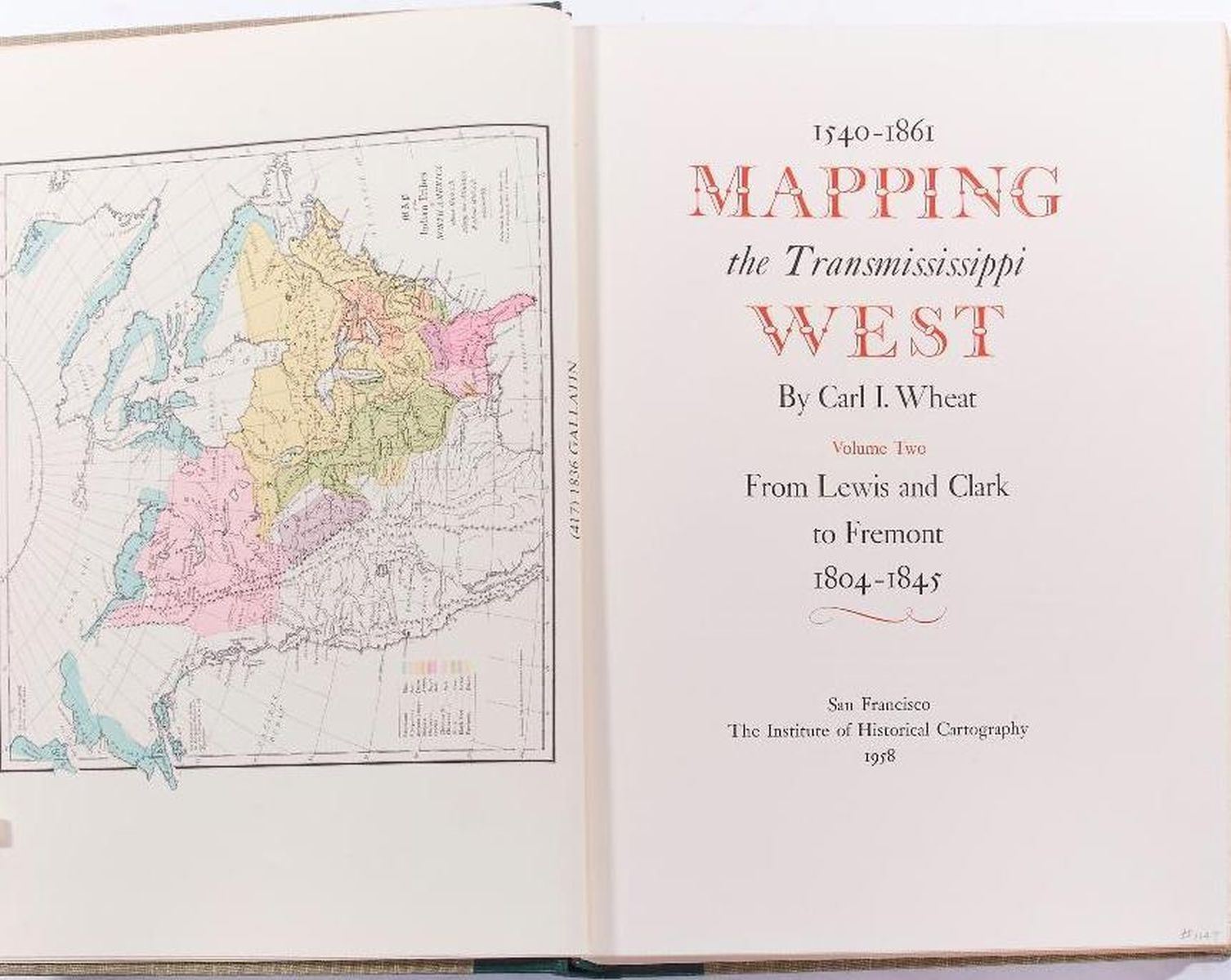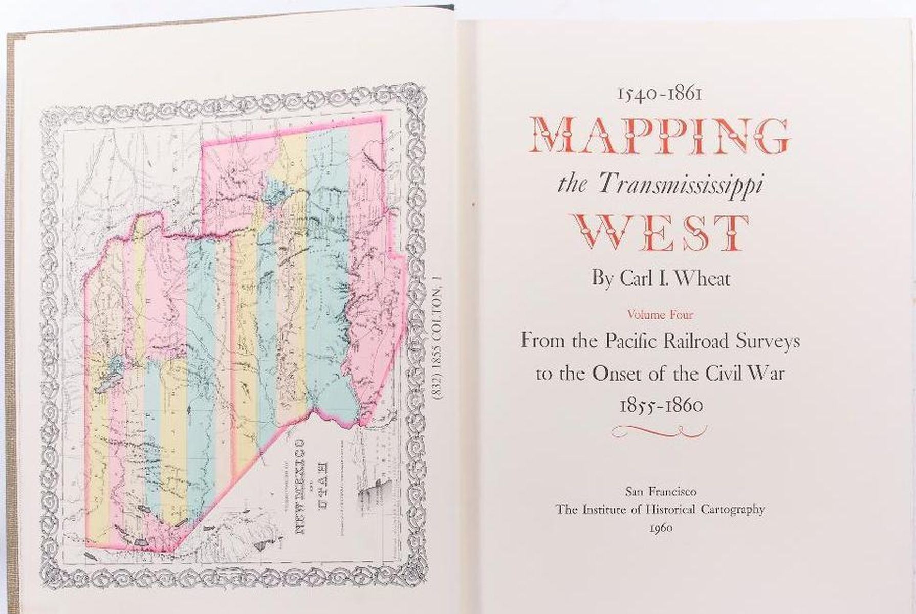 Title: Mapping the Trans Mississippi West Author: Carl I. Wheat Place: San Francisco Publisher: The Institute of Historical Cartography, Date: 1957-1960 Description: 1957-1960: Volume 1, 2, 3 & 4. First edition. Limited to 1000 copies. Hardcover. Each volume bound linen cloth, with spine gilt lettering. Facsimile of hundreds of maps. v. 1. The Spanish entrada to the Louisiana Purchase, 1540-1804. v. 2. From Lewis and Clark to Fremont, 1804-1845. v. 3. From the Mexican War to the Boundary Surveys, 1846-1854. v. 4. From the Pacific Railroad Surveys to the onset of the Civil War, 1855-1860. Condition: Very good condition.