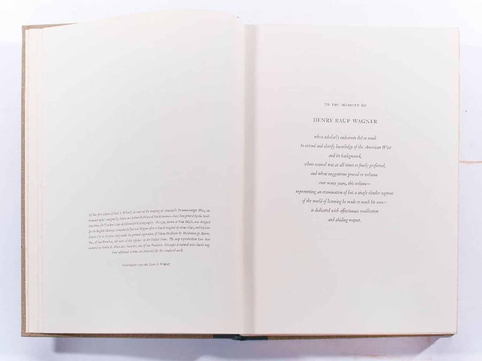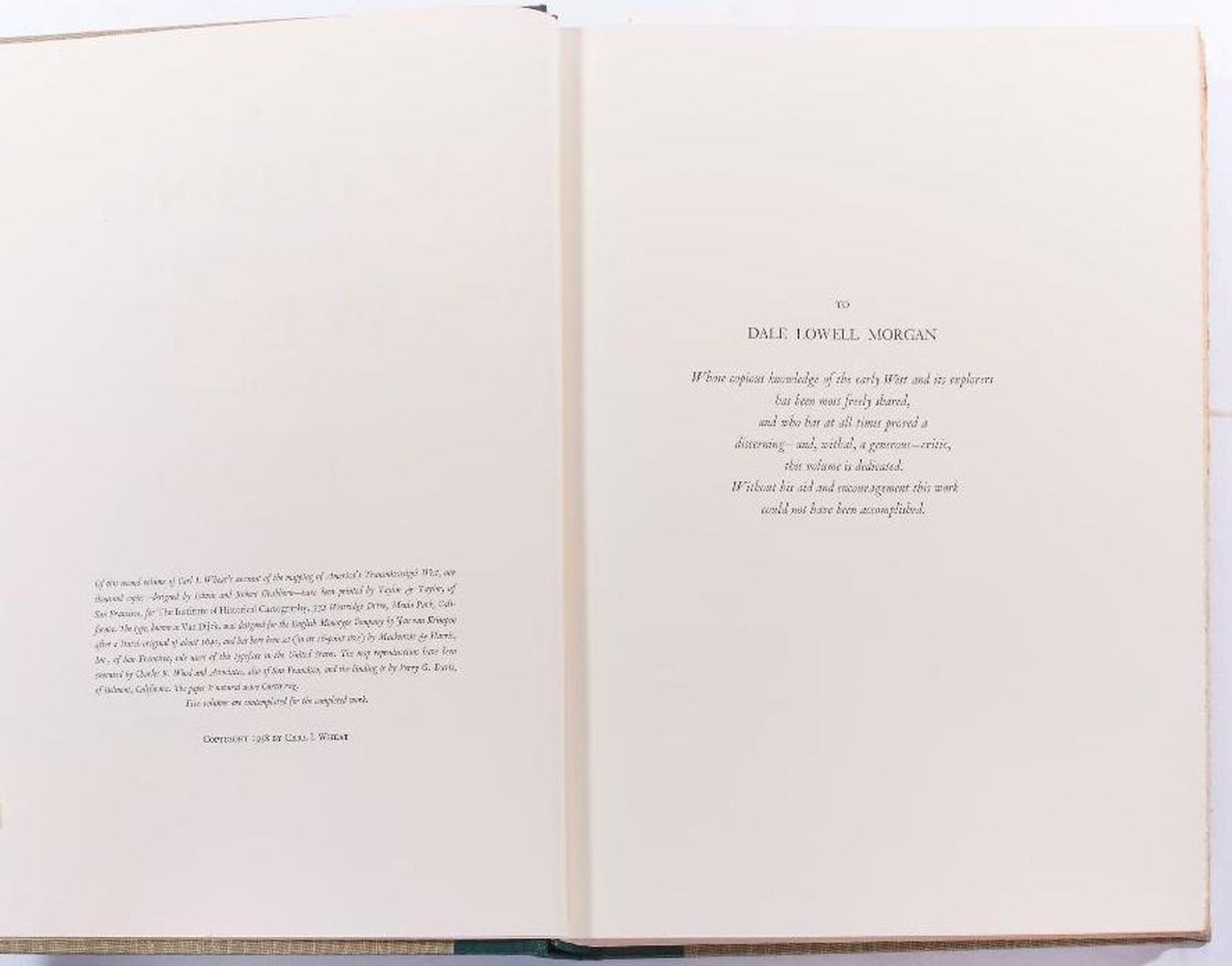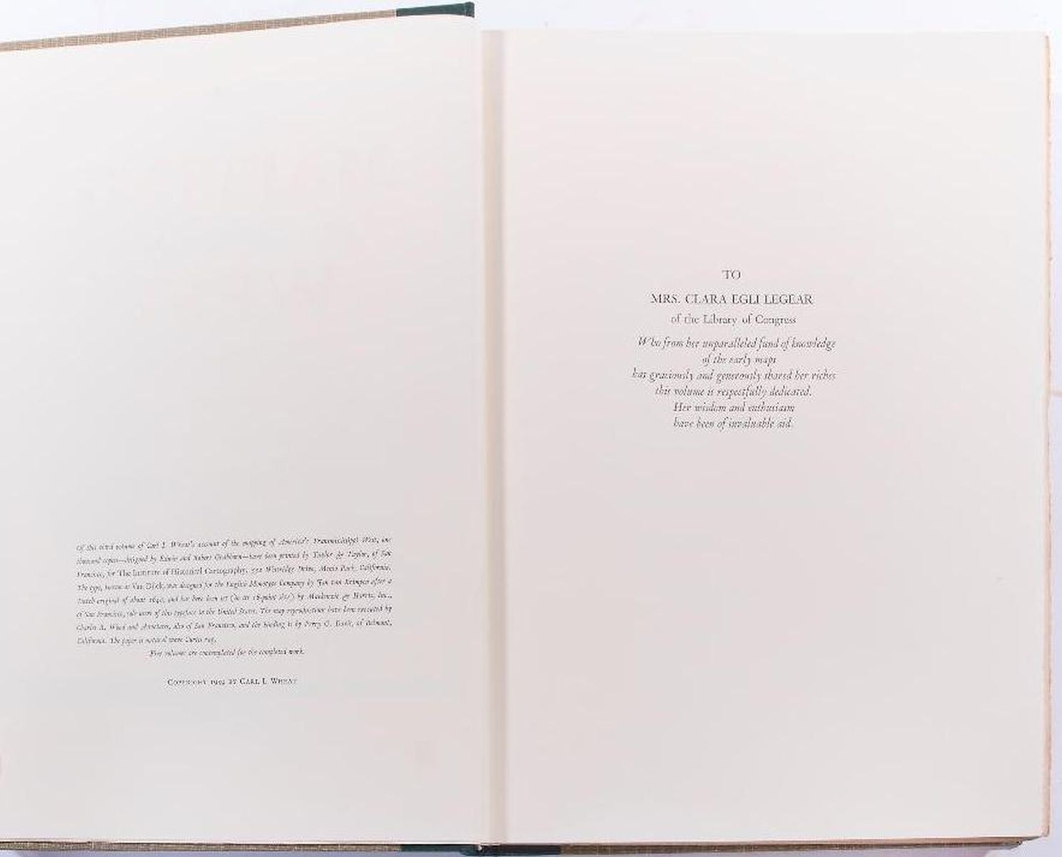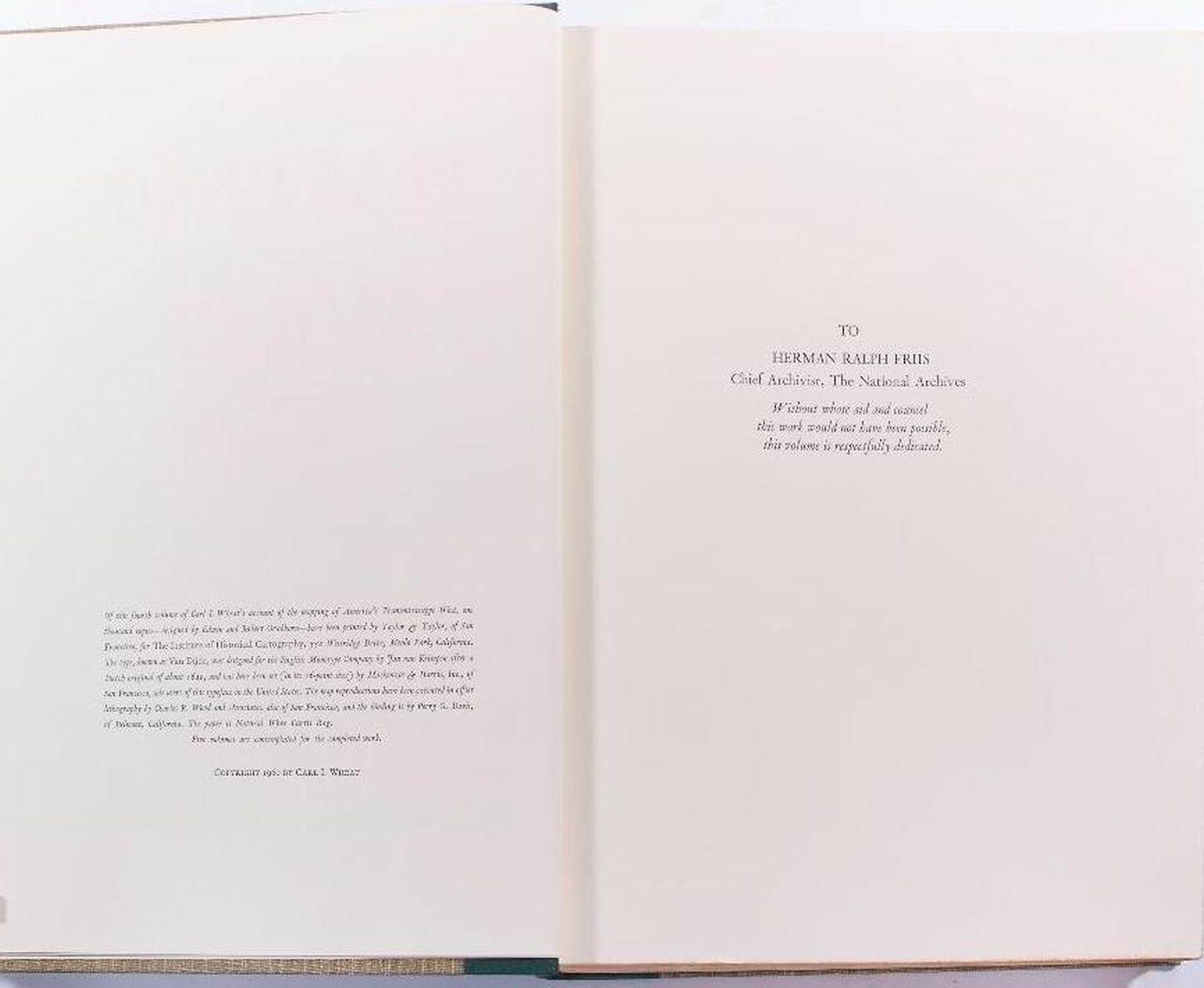 Title: Mapping the Trans Mississippi West Author: Carl I. Wheat Place: San Francisco Publisher: The Institute of Historical Cartography, Date: 1957-1960 Description: 1957-1960: Volume 1, 2, 3 & 4. First edition. Limited to 1000 copies. Hardcover. Each volume bound linen cloth, with spine gilt lettering. Facsimile of hundreds of maps. v. 1. The Spanish entrada to the Louisiana Purchase, 1540-1804. v. 2. From Lewis and Clark to Fremont, 1804-1845. v. 3. From the Mexican War to the Boundary Surveys, 1846-1854. v. 4. From the Pacific Railroad Surveys to the onset of the Civil War, 1855-1860. Condition: Very good condition.