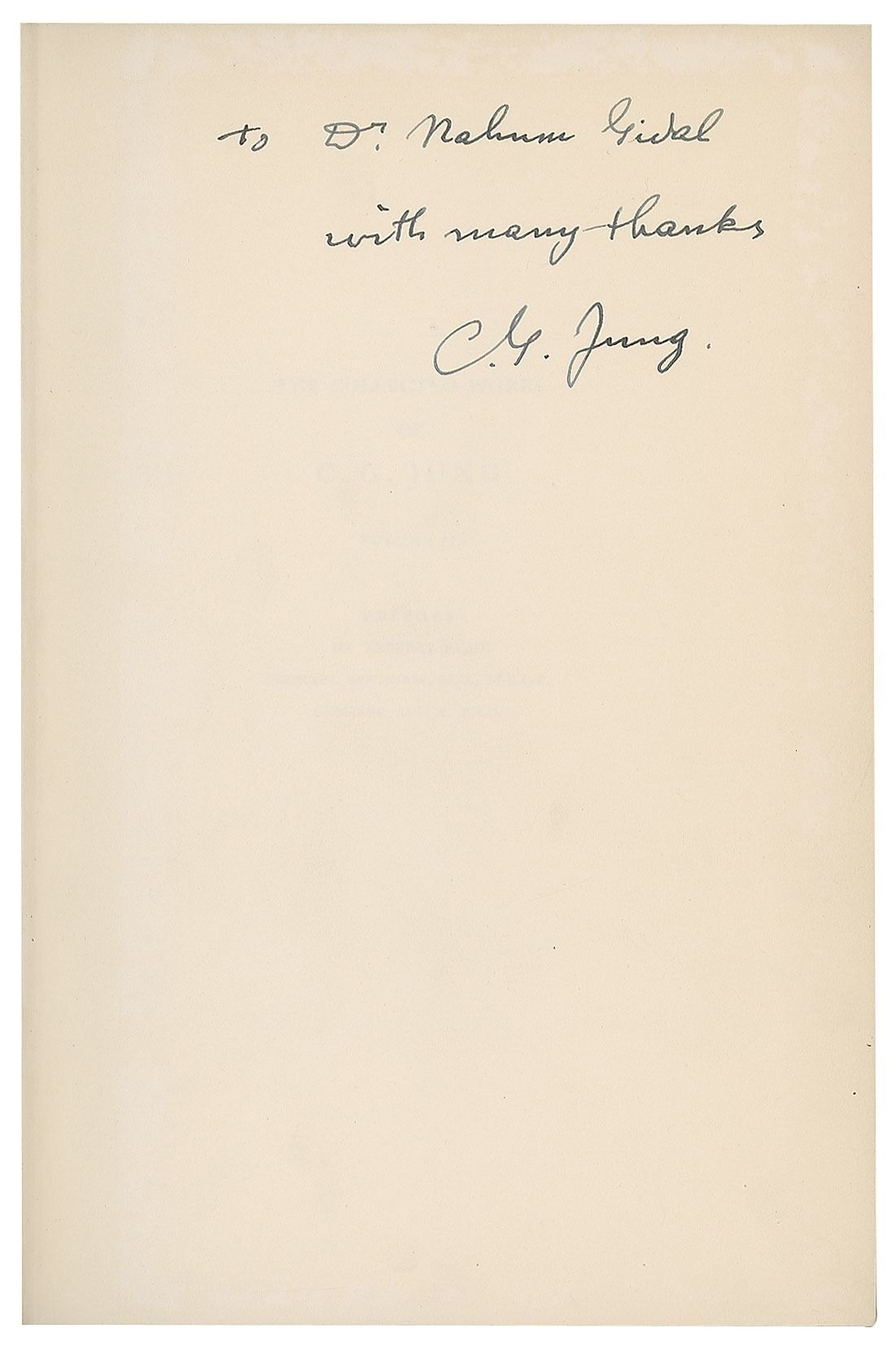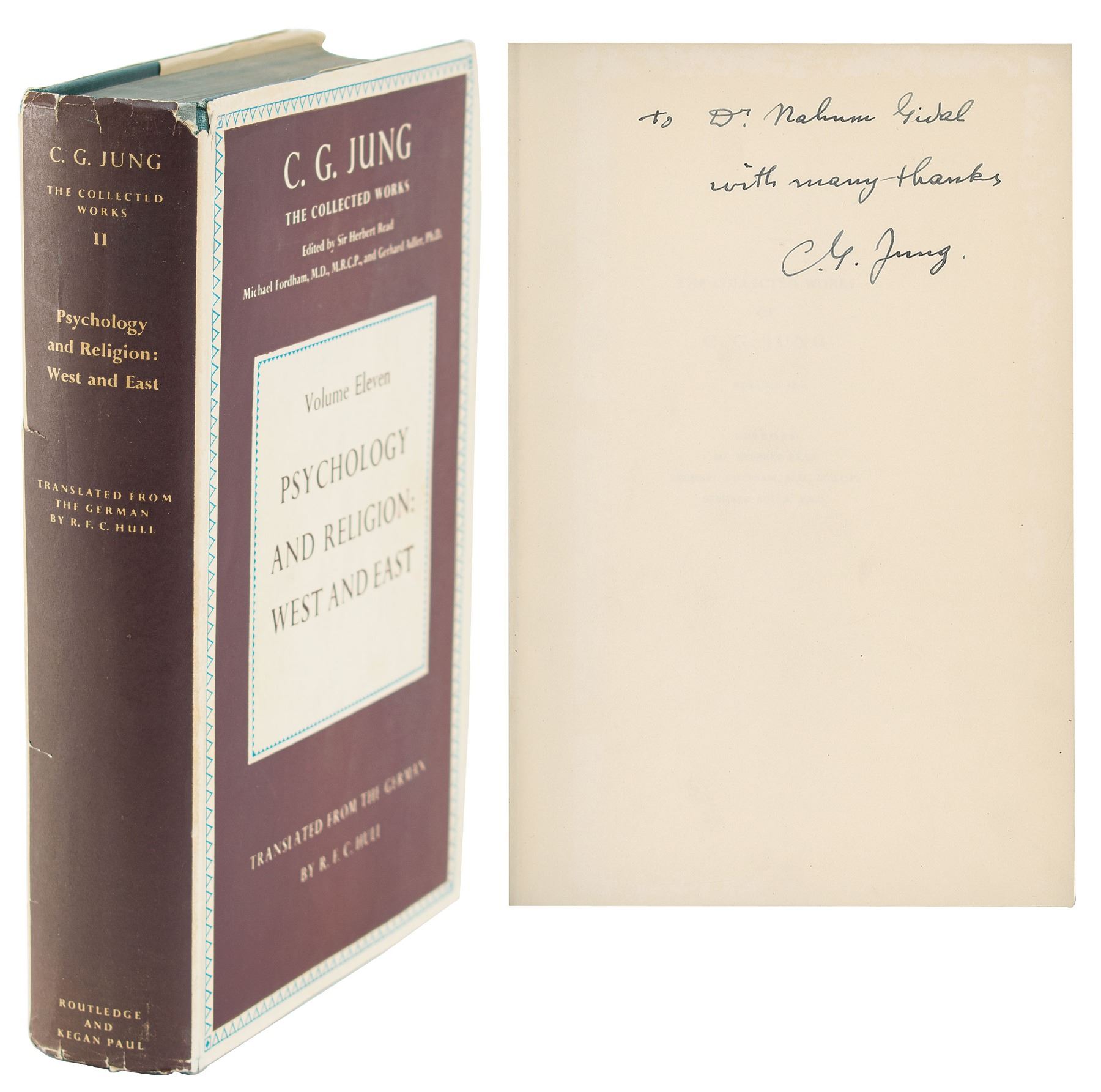 Signed book: C. G. Jung, The Collected Works, Vol. 11: Psychology and Religion: West and East. First edition. London: Routledge & Kegan Paul, 1958. Hardcover bound in green cloth with gilt stamping, with dust jacket, 6.5 x 9.5, 699 pages. Boldly signed and inscribed on the first free end page in fountain pen, "To Dr. Nahum Gidal, with many thanks, C. G. Jung." Autographic condition: fine. Book condition: VG+/VG, with several small tears and splits to the dust jacket, and a "Library of Lawrence E. Miller" blindstamp to the final page. Nahum Tim Gidal was a noted German-Israeli photographer, considered to be a pioneer of modern photojournalism.
