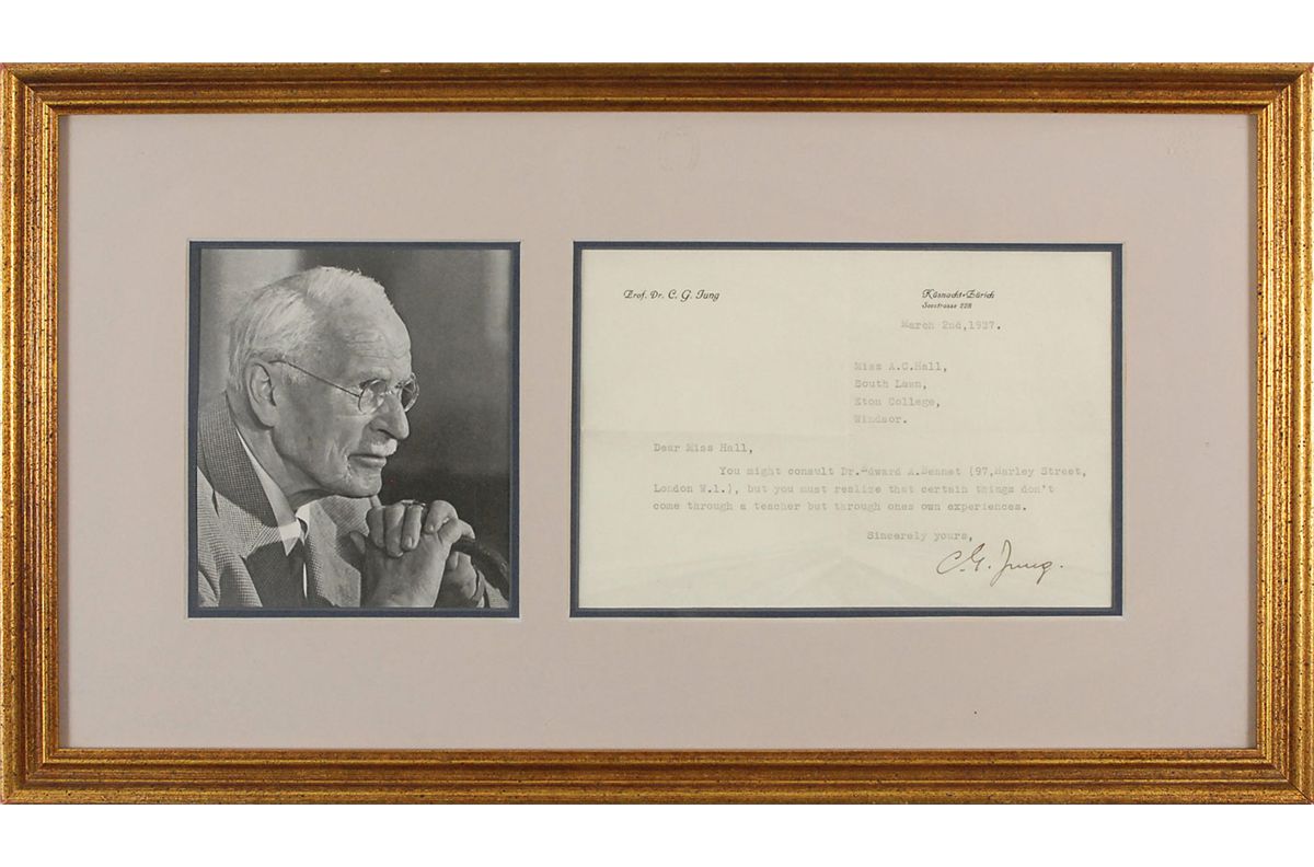 TLS signed “C. G. Jung,” one page, 8 x 5.5, personal letterhead, March 2, 1937. Letter to Miss A. C. Hall. In full: “You might consult Dr. Edward A. Bennet (97, Harley Street, London W. 1.) but you must realize that certain things don’t come through a teacher but through ones own experiences.” Double-matted and framed with a portrait of Jung to an overall size of 19.5 x 11. In fine condition, with central horizontal and vertical folds and a few light creases to lower portion, a couple passing through (but not affecting) signature. Edward Bennet was a longtime friend of Jung’s, who wrote two major works on the psychologist, and was integral in establishing Jung’s ideas in England.