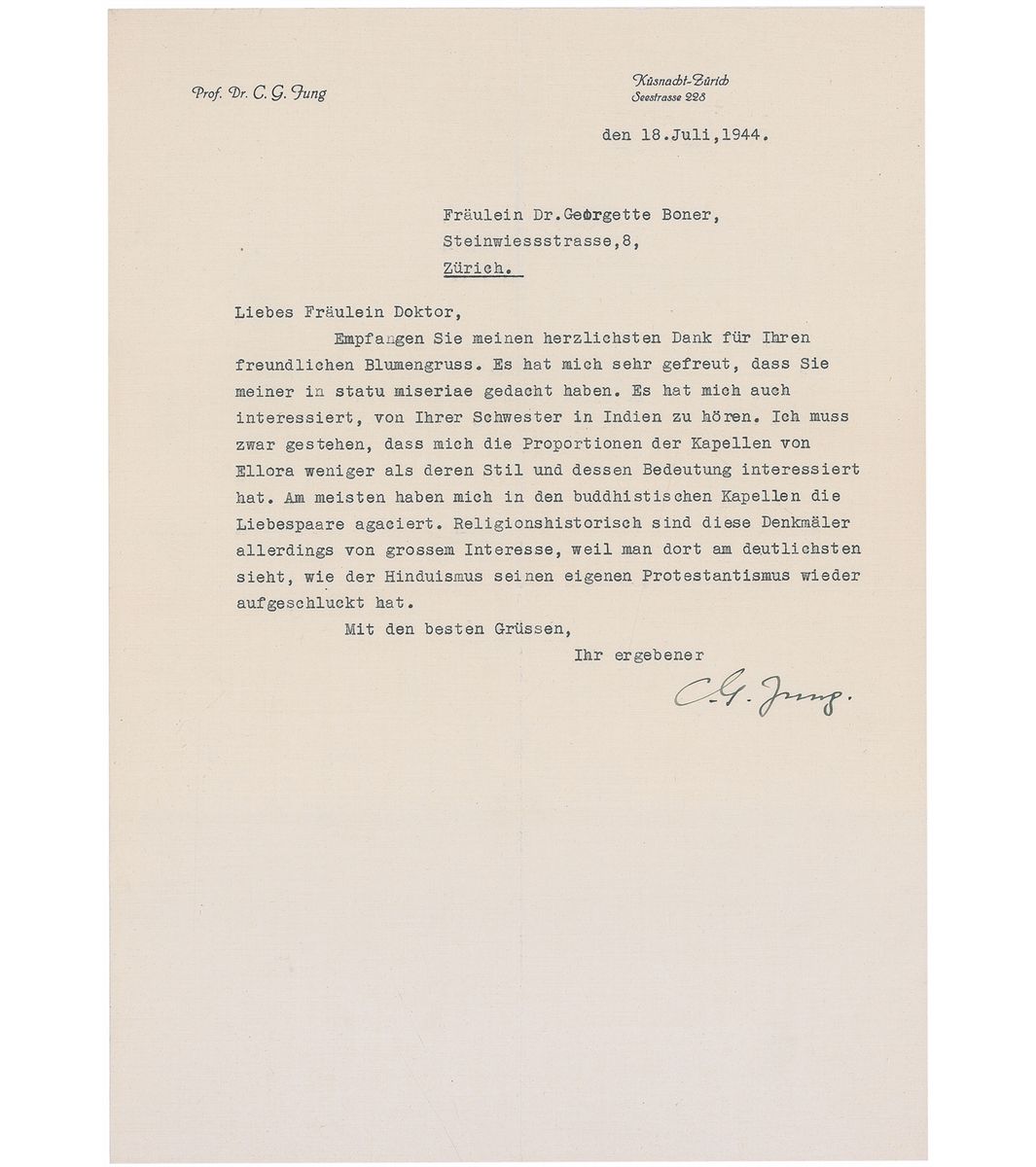 TLS in German, signed “C. G. Jung,” one page, 8.25 x 11.5, personal letterhead, July 18, 1944. Letter to Dr. Georgette Boner in Zurich. In full (translated): “Accept my sincere thanks for your kind ‘flower greeting.’ It made me very happy that you have thought in statu miseria on me. It also interests me to hear about your sister in India. Although I must confess, that I am less interested in the proportions of the chapels of Ellora as in its style and its meaning. In the Buddhist chapels my main interest was the lovers. Religio-historically these monuments, however, are of great interest, because you can see most clear, as Hinduism has swallowed up its own Protestantism again.” In fine condition. Accompanied by an unsigned postcard photo of Jung.