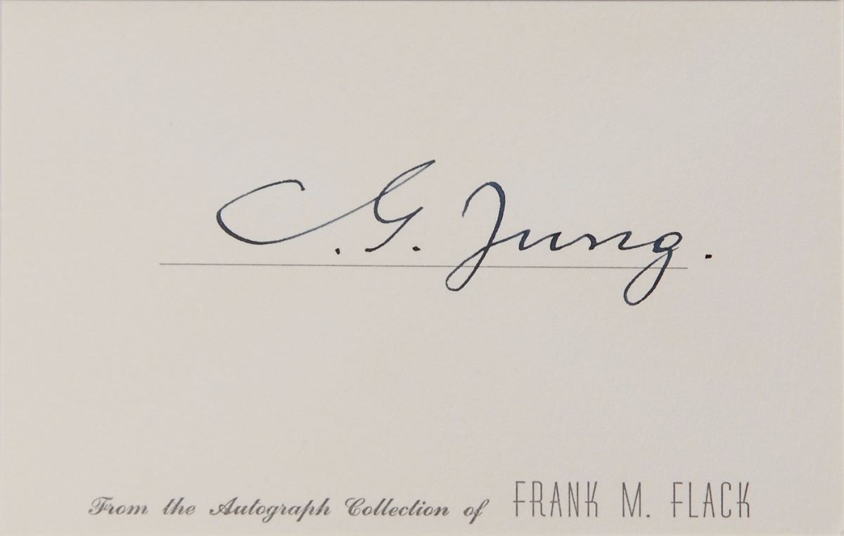 Bold ink signature, “C. G. Jung,” on an off-white 5.25 x 3.25 autograph card. In very fine condition. Accompanied by the original mailing envelope, postmarked October 26, 1960.