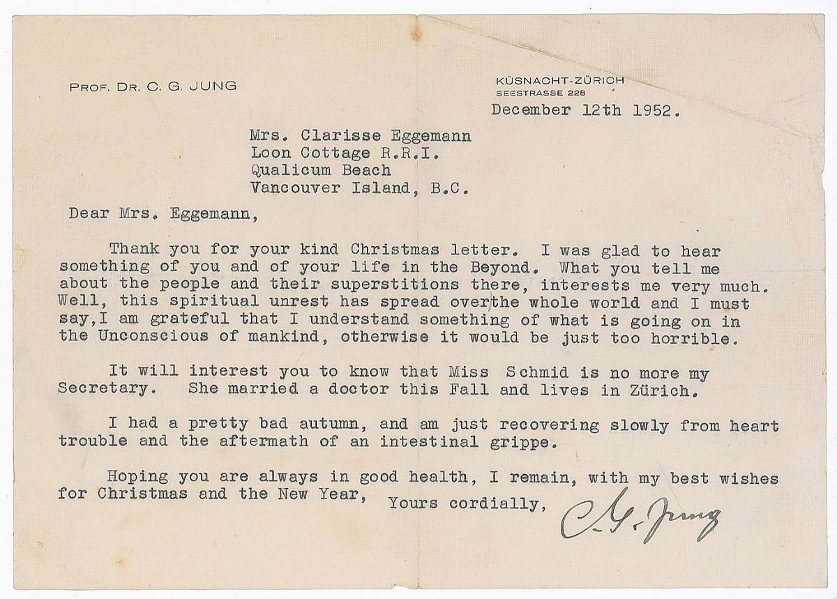 TLS signed "C. G. Jung," one page, 8 x 5.75, personal letterhead, December 12, 1952. Letter to Clarisse Eggemann, in part: "Thank you for your kind Christmas letter. I was glad to hear something of you and of your life in the Beyond. What you tell me about the people and their superstitions there, interests me very much. Well, this spiritual unrest has spread over the whole world and I must say, I am grateful that I understand something of what is going on in the Unconscious of mankind, otherwise it would be just too horrible. It will interest you to know that Miss Schmid is no more my Secretary. She married a doctor this Fall and lives in Zurich. I had a pretty bad autumn, and am just recovering slowly from heart trouble and the aftermath of an intestinal grippe." In fine condition, with scattered creasing, light spots of foxing, and trimmed edges. Pre-certified PSA/DNA.