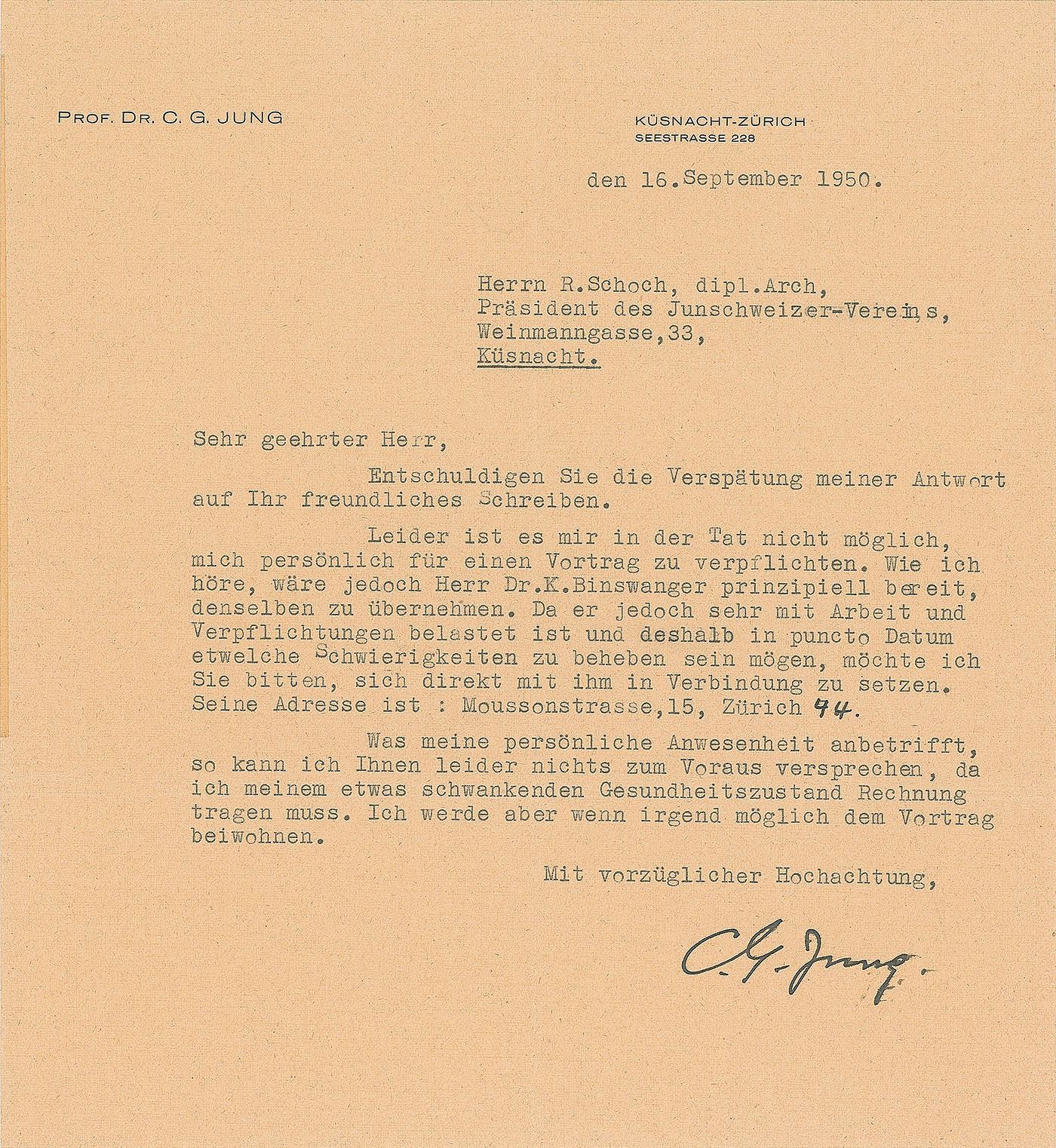 TLS in German, signed “C. G. Jung,” one page, 7.75 x 8.5, personal letterhead, September 16, 1950. Letter to Herr R. Schoch, in full (translated): "Excuse me for this late reply to your friendly letter. Unfortunately, it is indeed impossible to commit myself for a lecture in person. As I am told, however, Dr. K. Binswanger would be willing on principle to give it for me. But since he is burdened with work and obligations, and thus, as regards the date, several difficulties may have to be surmounted, I would like to ask you to contact him directly. His address is: Moussonstrasse 15, Zürich 44. As to my being there in person, I unfortunately cannot promise you anything in advance, as I must take my somewhat unsteady state of health into account. But if at all possible, I will be present at the lecture." In fine condition, with an extremely thin strip of tape along the extreme left edge.