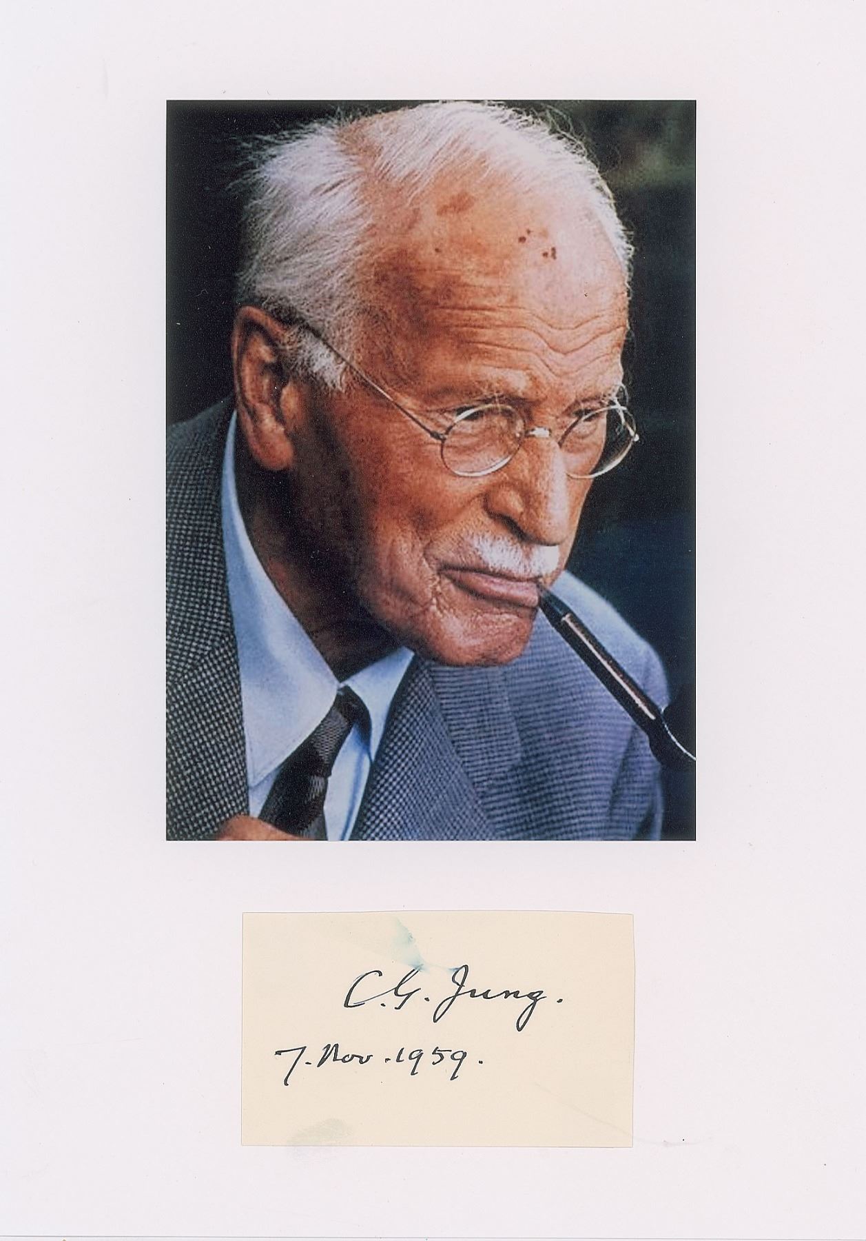 Vintage fountain pen signature, "C. G. Jung, 7 Nov. 1959,” on an off-white 3.75 x 2.25 slip, affixed to a larger sheet below a portrait of the pioneering psychoanalyst. In fine condition, with a light smudge touching the tops of two letters of the signature.